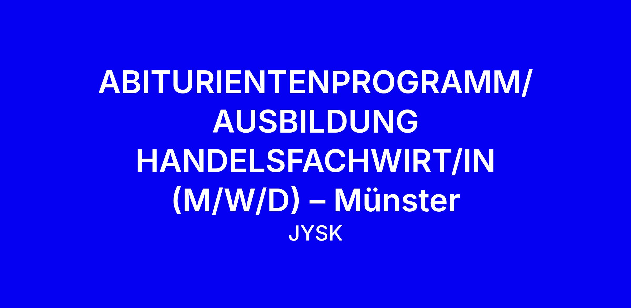 Das ABITURIENTENPROGRAMM bei JYSK in Münster ist eine dreijährige, praxisnahe Ausbildung mit drei IHK-Abschlüssen (Kaufmann/-frau im Einzelhandel, Handelsfachwirt/in Bachelor Professional, Ausbilderschein), die dir schon während der Lehrzeit Verantwortung ermöglicht und nach Abschluss den Weg zur Filialleitung ebnet. Die Praxis lernst du im Store, die Theorie im Bildungszentrum Niedersachsen, inklusive Unterbringung, Verpflegung sowie Fahrt- und Übernachtungskosten; eine digitale Lernwelt begleitet dich. Nach sehr guten Leistungen winkt ein einjähriges Traineeprogramm zum Verkaufsleiter. Vergütung: 1.300 € im 1. Jahr, 2.230 € im 2. und 3. Jahr, zusätzlich 50 € Sachbezug, 36 Tage Urlaub, Weihnachts- und Urlaubsgeld, 20% Mitarbeiterrabatt, sowie 2 Samstage frei im 1. Jahr. Start zum 01.08.2026. Bewerbe dich mit Abitur oder vollständiger Fachhochschulreife, Begeisterung für Lifestyle, Teamfähigkeit, Kommunikationsstärke und Leadership-Potenzial; zeig, warum du zu JYSK passt, und nutze die Karrierewebseite.