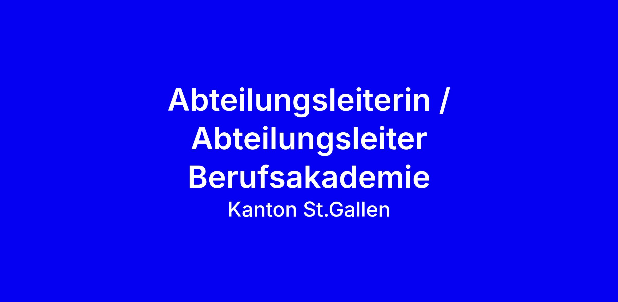 Der Kanton St.Gallen sucht für das BWZT Toggenburg in Wattwil eine/n Abteilungsleiter/in Berufsakademie (85 Prozent, ab 01.08.2026 oder nach Vereinbarung). Die Aufgabe umfasst die operative Abteilungsleitung, die Sicherstellung der nachhaltigen Finanzierung, die Weiterentwicklung der Bildungsangebote mit Partnern, Marketing und Personalführung, Mitgestaltung der Schulentwicklung sowie stellvertretende Aufgaben der Verwaltungsleitung; zudem 10 Prozent Dozententätigkeit. Voraussetzungen: kaufmännische Grundausbildung, Ausbildung und Erfahrung in der Erwachsenenbildung mit eidg. Fachausweis oder gleichwertig, mehrjährige Führungserfahrung, starkes strategisches Denken, engagierte, selbstorganisierte Persönlichkeit. Wir bieten abwechslungsreiche, verantwortungsvolle Tätigkeiten, attraktive Anstellungsbedingungen, ein modernes Umfeld und Fortbildungsmöglichkeiten. Bewerben Sie sich mit konkreten Erfolgen in Finanzen, Projekten, Partnerschaften und Ihrer Bereitschaft zur Lehrtätigkeit. Ansprechpartnerin: Yvonne Betschart, 058 229 85 81, [email protected].