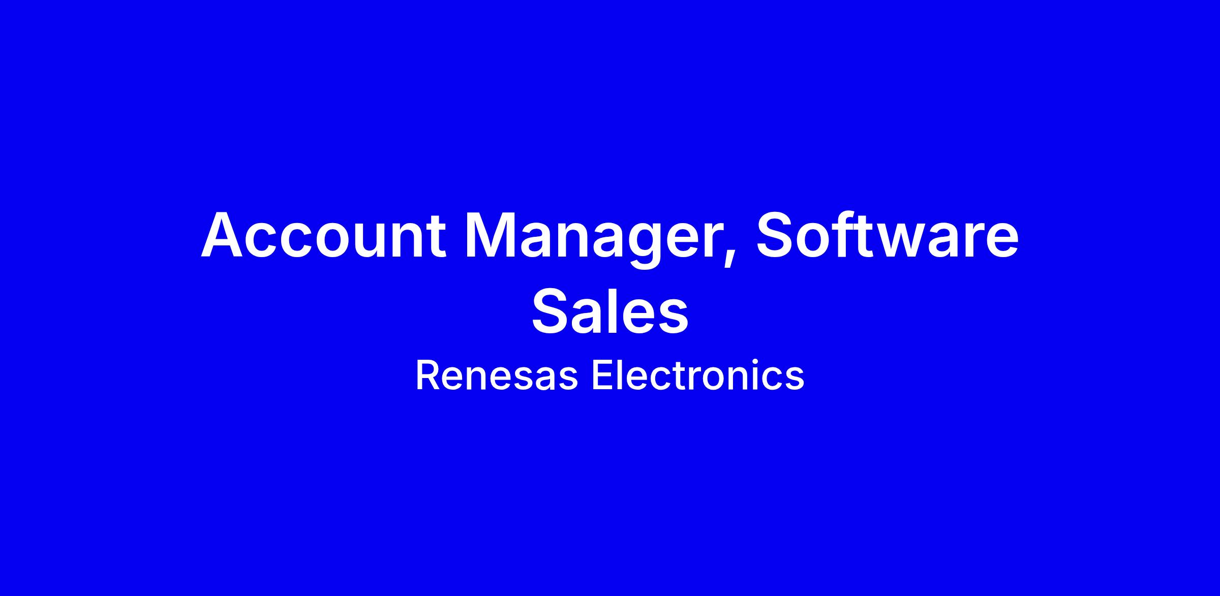 Renesas Electronics seeks an Account Manager for the Renesas 365 platform in Munich, a full-time on-site role focusing on new and expansion sales within enterprise accounts. You will own the full sales cycle, execute the GTM strategy, and build trusted relationships from engineering leads to executives while collaborating with Solution Engineers to demonstrate value through demos and proofs of concept. Success hinges on quota achievement in complex B2B cycles, deep knowledge of design software workflows, and a consultative, value-based approach. To apply, tailor your resume to quantify pipeline, bookings, and revenue, show cross-functional collaboration, and highlight engineering or R&D stakeholder engagement. A BS is required; MBA preferred; hybrid two days remote.