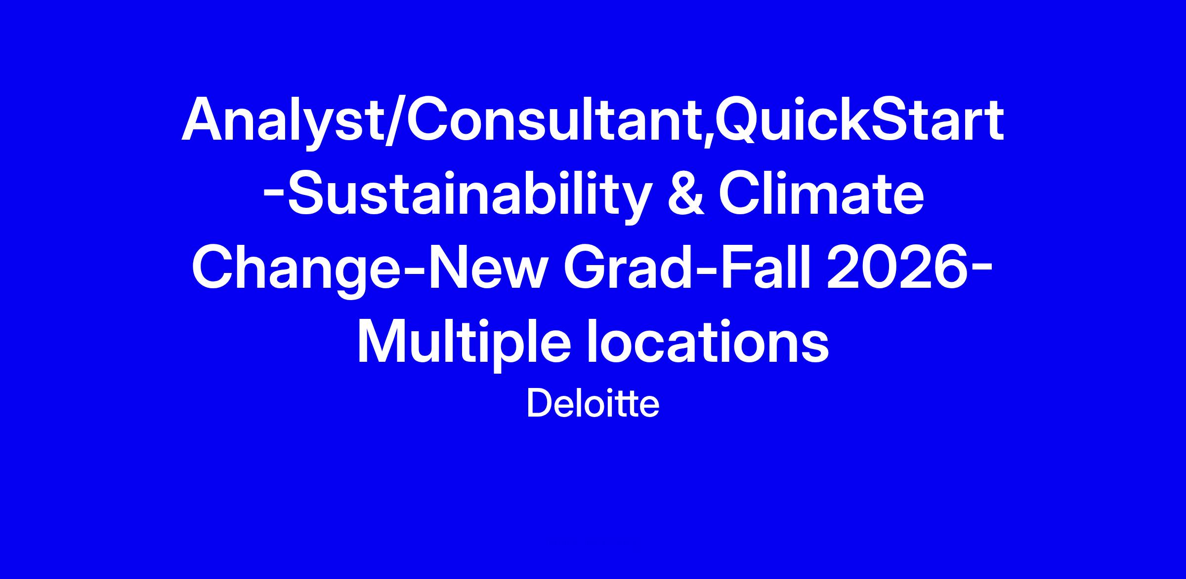 Join Deloitte’s QuickStart program as an Analyst/Consultant in Sustainability, Fall 2026, with hybrid work in Toronto or Calgary. You will shape decarbonization and low-carbon fuel strategies by analyzing market trends, policy developments, building business cases and financial models. The ideal candidate is completing a post-secondary degree by September 2026 with strong academics, solid quantitative and qualitative analysis, and the ability to synthesize financial and ESG metrics into client recommendations. Salary ranges from $56,000 to $84,000 with potential bonus. Apply by Oct 19, 2025 with ONE PDF document containing your cover letter, resume and unofficial transcript; tailor materials to show teamwork, clear communication, and adaptability to ambiguous client environments, and demonstrate genuine interest in Deloitte’s purpose.