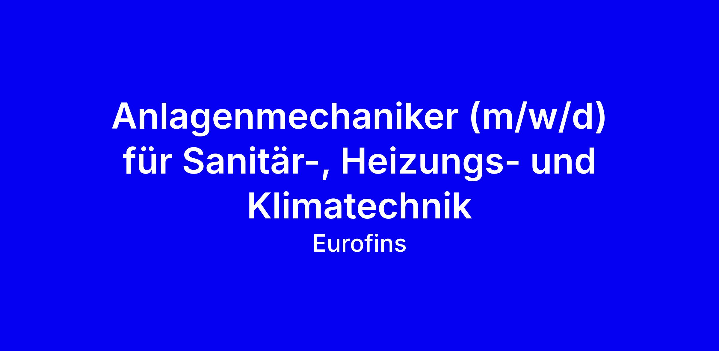 Zur Verstärkung unseres dynamischen Teams der Eurofins Umwelt Ost GmbH suchen wir Dich als Anlagenmechaniker (m/w/d) für Sanitär-, Heizungs- und Klimatechnik zum nächstmöglichen Zeitpunkt am Standort Freiberg in unbefristeter Anstellung.