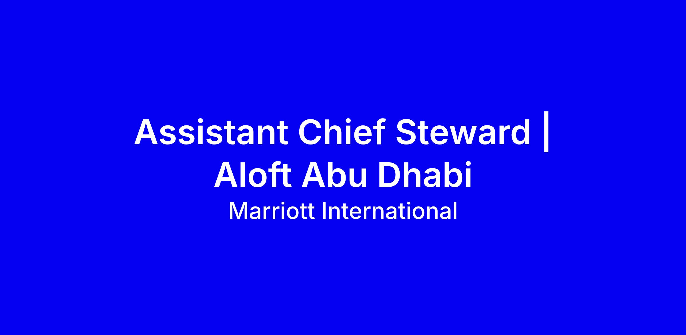 Assistant Chief Steward at Aloft Abu Dhabi, a full‑time onsite role with Marriott International, directs Stewards, ensures cleaning standards and safety, monitors water temperature and chemical levels, assists with banquet plate-ups, supports cooks, and manages stock for banquets and buffets while returning items to the correct locations and operating cleaning equipment. The job also involves hiring, training, scheduling, evaluating, coaching and motivating staff, enforcing company policies, and delivering guest‑centered service through teamwork. Preferred: high school diploma or GED, at least 2 years related experience, and at least 1 year of supervisory experience. Lift up to 50 pounds, stand long periods. Marriott is an equal opportunity employer.