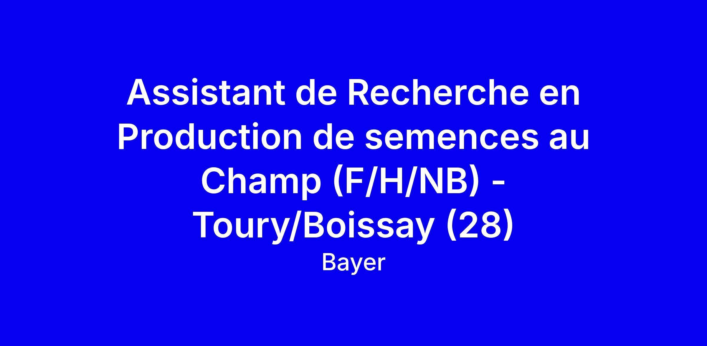 Ce poste d Assistant de Recherche en Production de semences au Champ chez Bayer Seeds SAS à Toury Boissay est un CDI terrain qui allie production agricole et dimension technique. Vous intégrerez l équipe Seed Production et participerez à la mise en place, au suivi et à la récolte des semences dans les programmes de sélection, en réalisant les opérations culturales manuelles et mécanisées, la conduite des tracteurs et le suivi agronomique des parcelles, ainsi que la traçabilité des lots et la maintenance des équipements. Profil recherché: formation BTS DUT ou licence pro en productions végétales ou équivalent; goût du travail en extérieur, permis B, conduite de matériels, rigueur, autonomie et esprit d’équipe, bonnes bases Excel. Avantages: CDI, salaire brut annuel 25 000 à 32 000 € selon profil, primes, intéressement, mutuelle 65 %, plan d épargne, carte restaurant. Pour postuler: téléchargez votre CV et mettez en valeur votre expérience terrain et vos certifications potentielles (CACES, Certiphyto).