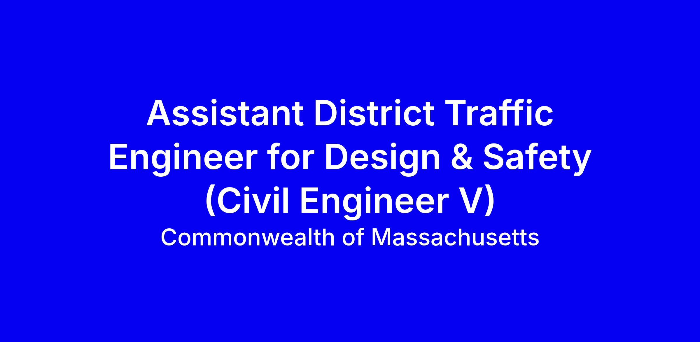 Massachusetts Department of Transportation seeks an Assistant District Traffic Engineer for Design and Safety (Civil Engineer V) in Worcester. This full-time on-site role, under the District Traffic Engineer, oversees design and safety planning, reviews CIP projects for MUTCD compliance, leads traffic operations analyses, and coordinates with divisions on data, ITS and connected vehicle initiatives. You will run crash queries in IMPACT, assist HSIP eligibility, participate in Road Safety Audits and ICE procedures, and help shape the safety program and staff contracts. A signing bonus of up to $5,000 may apply for new hires. Apply online via MassCareers; highlight leadership, project impact, and compliance with standards; first 14 days preferred.