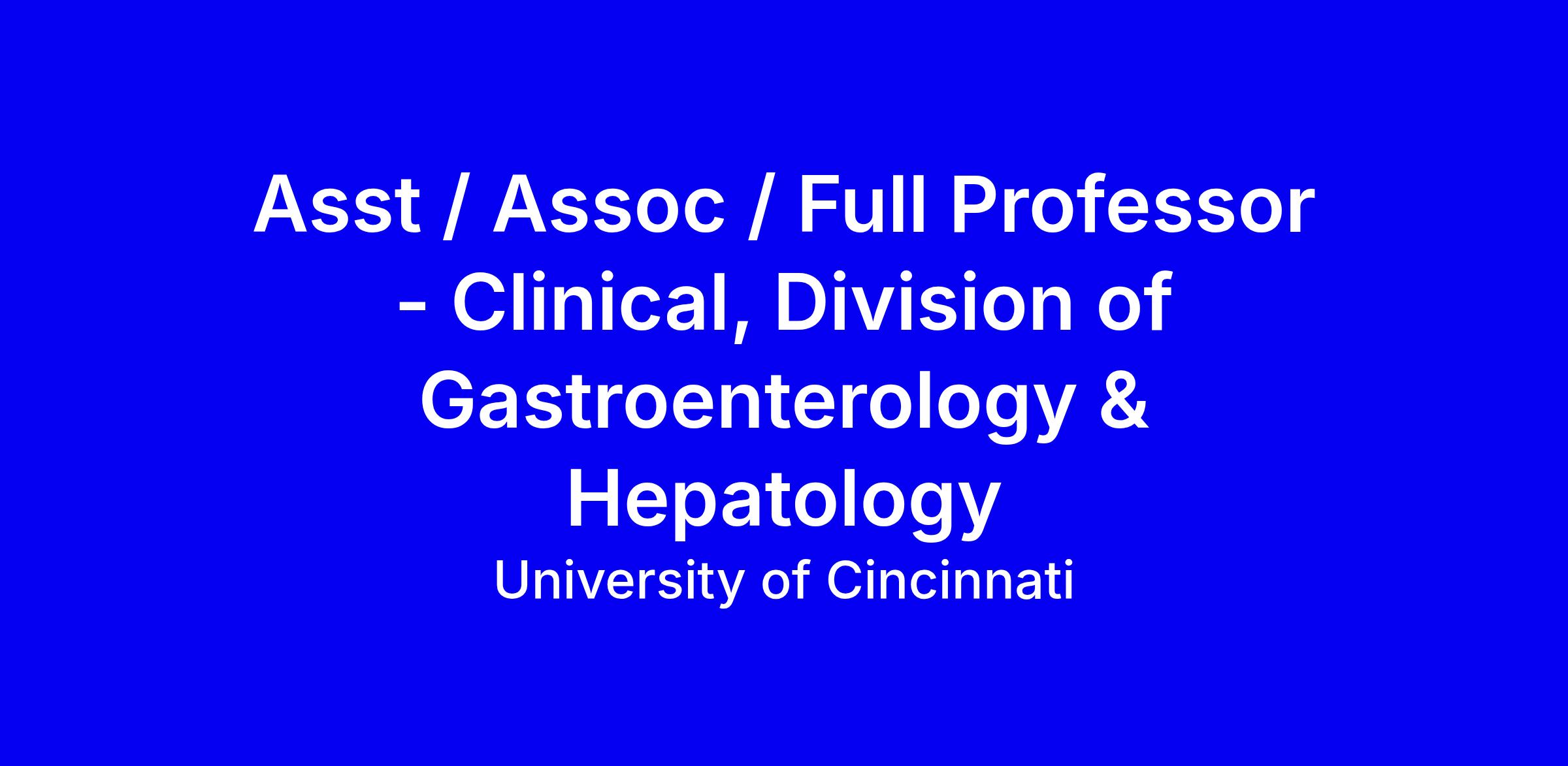 University of Cincinnati seeks an MD clinician to join the Division of Gastroenterology and Hepatology as an Assistant, Associate, or Full Professor to lead the new Motility and Neurogastroenterology Clinic. The role covers inpatient, outpatient, and endoscopy duties across UC Health sites, with teaching, patient care, and research supported by specialized staff. Requirements: MD or DO, Ohio medical license, Internal Medicine residency, Gastroenterology fellowship, and advanced fellowship in motility or neurogastroenterology. Apply through the UC portal; internal applicants must apply internally via SuccessFactors and email a career plan with three references to Dr. Luis F Lara after submission. Highlight leadership, collaboration, and a plan to build a multidisciplinary, evidence-based clinic; show neurogastroenterology activity and scholarly work.