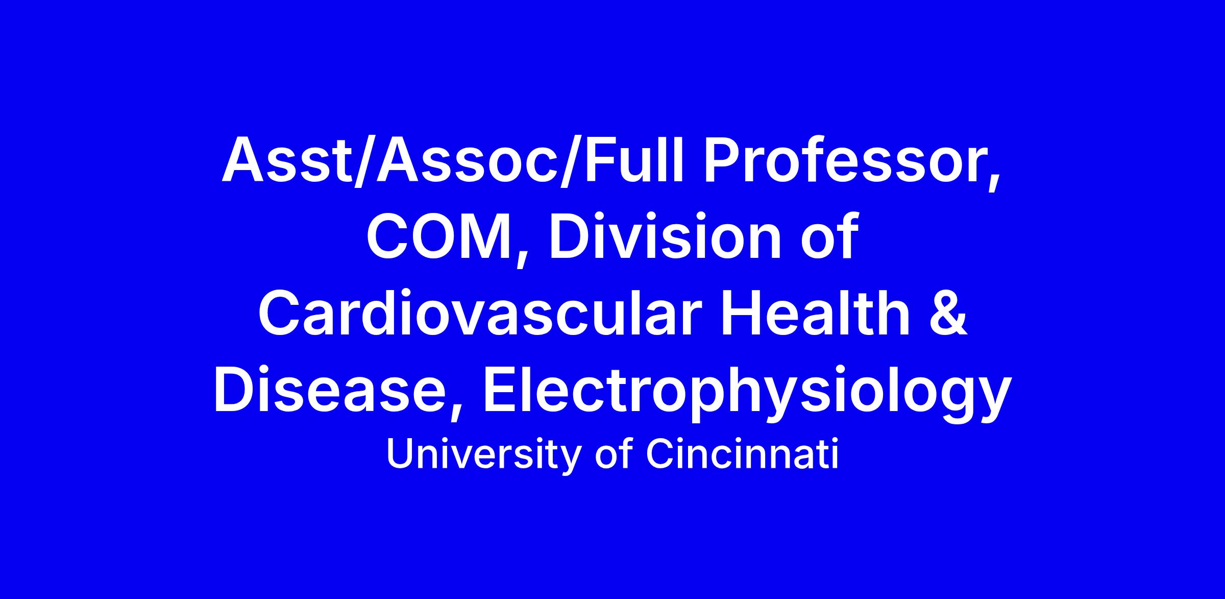 University of Cincinnati College of Medicine seeks an Asst/Assoc/Full Professor in the Division of Cardiovascular Health and Disease with emphasis in General Cardiology and Electrophysiology. This faculty role encompasses ambulatory and hospital care, education and training, and leadership in quality improvement and research, with rank commensurate with experience. Requirements: MD or DO, 3-year Internal Medicine residency, 3-year Cardiovascular Disease fellowship, 2-year Clinical Cardiac Electrophysiology Fellowship, and Ohio medical and DEA licenses. Competitive benefits include tuition remission, diversified retirement options, generous leave, and balanced work life. To apply, current UC employees must apply internally via SuccessFactors; all applicants use the UC applicant portal, upload CV, cover letter, transcripts, and references; official transcripts required at hire; inquiries to [email protected].