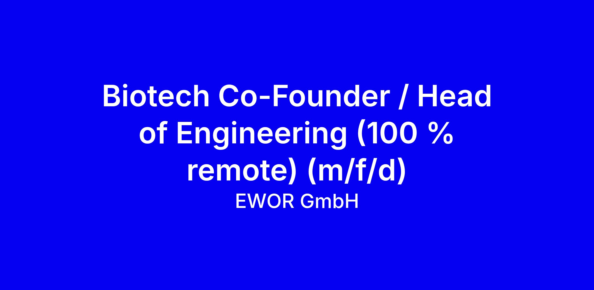 EWOR seeks Biotech founders to join as Co-Founder and Engineering Lead in a remote role. You will own and run a startup with either a salary or up to €500k in funding, plus weekly sparring with unicorn founders and access to a community and hiring network. You’ll receive coaching to reach product-market-fit and to build a sales and marketing engine, with funding support for multi-million rounds within 12 months. Requirements: based in Europe or the Americas or willing to relocate; prepared to take full responsibility and scale to €100M+ revenue; excellent English. To apply, share a concise biotech plan with milestones and leadership evidence and how you will leverage EWOR’s network.
