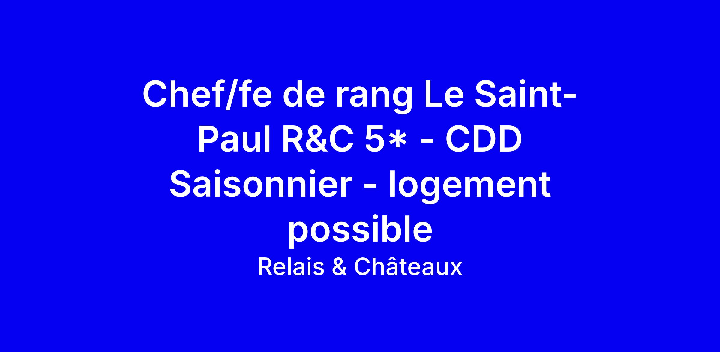 Le poste de Chef de rang au Saint-Paul Relais & Châteaux 5 étoiles est un CDD saisonnier de mars à novembre 2026, logement possible, au cœur de Saint Paul de Vence dans un cadre luxueux où l’excellence et la tradition priment. Vous assurerez les services de table, dirigerez les équipes et coordonnerez les autres services pour offrir une expérience client irréprochable tout en générant des ventes additionnelles et en veillant à l’entretien du matériel. Profil recherché: formation hôtelière, excellent relationnel, rigueur, esprit d’équipe et maîtrise de l’anglais, une seconde langue étant souhaitée. Conseils d’application: adaptez votre CV et votre lettre à l’hôtellerie de luxe, mettez en avant des exemples concrets de management et de satisfaction client, montrez votre disponibilité et votre intérêt pour Relais & Châteaux et le cadre provençal, et postulez avec CV et lettre.