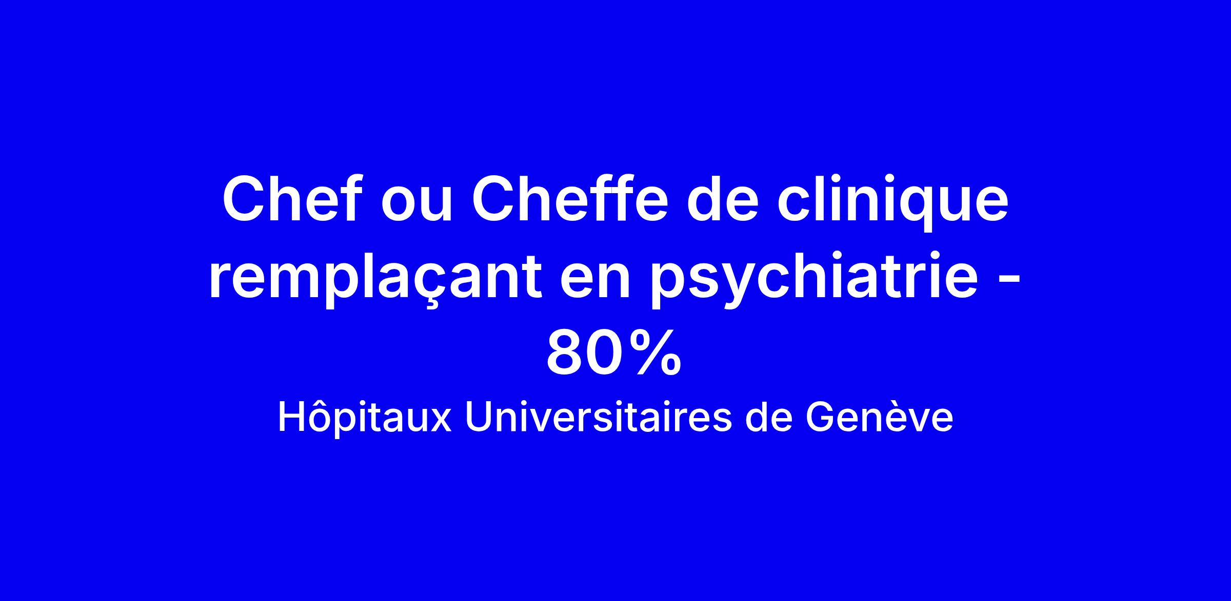 Cette offre de Chef ou Cheffe de clinique remplaçant en psychiatrie 80 % aux Hôpitaux Universitaires de Genève propose de prendre en charge une unité de soins au sein du service de psychiatrie gériatrique, avec supervision des médecins internes et participation aux piquets. Le poste offre un plan de carrière avec mentorat et des axes approfondissables en clinique, recherche, enseignement et management, ainsi qu une possibilité de temps dédié à la recherche. Français requis, niveau C1 pour les non francophones. Présentez une candidature complète comprenant une lettre motivation, CV, copies diplômes et attestations, et les deux derniers certificats de travail, avant le 27.02.2026, via la plateforme de recrutement. Pour toute information, contactez Dr Mohamed Eshmawey.