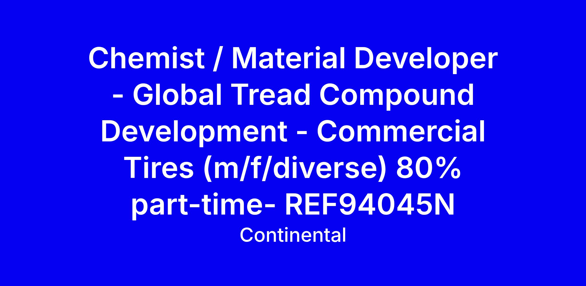 Continental seeks a Chemist / Material Developer for global tread compound development in commercial tires, 80% part-time, on-site in Hannover. You will lead and contribute to projects delivering best in class tread material performance, develop material and process specifications, transfer new technologies into commercial vehicle tread compounds, support quality processes, optimize performance through compound pattern know-how, ensure health and safety, and document know-how in the compounding design guide while advising colleagues. Requirements: Master or PhD in Chemistry or Natural Sciences, ideally first experience in rubber chemistry or compounding, strong customer focus, fluent English, analytical and innovative mindset, intercultural competence. Benefits include tariff-based salary, 30 vacation days plus three future-value days, flexible work, cross-border mobility, pension, childcare, canteen, and more. Reference REF94045N. Apply online and share how you will contribute to Continental’s values.