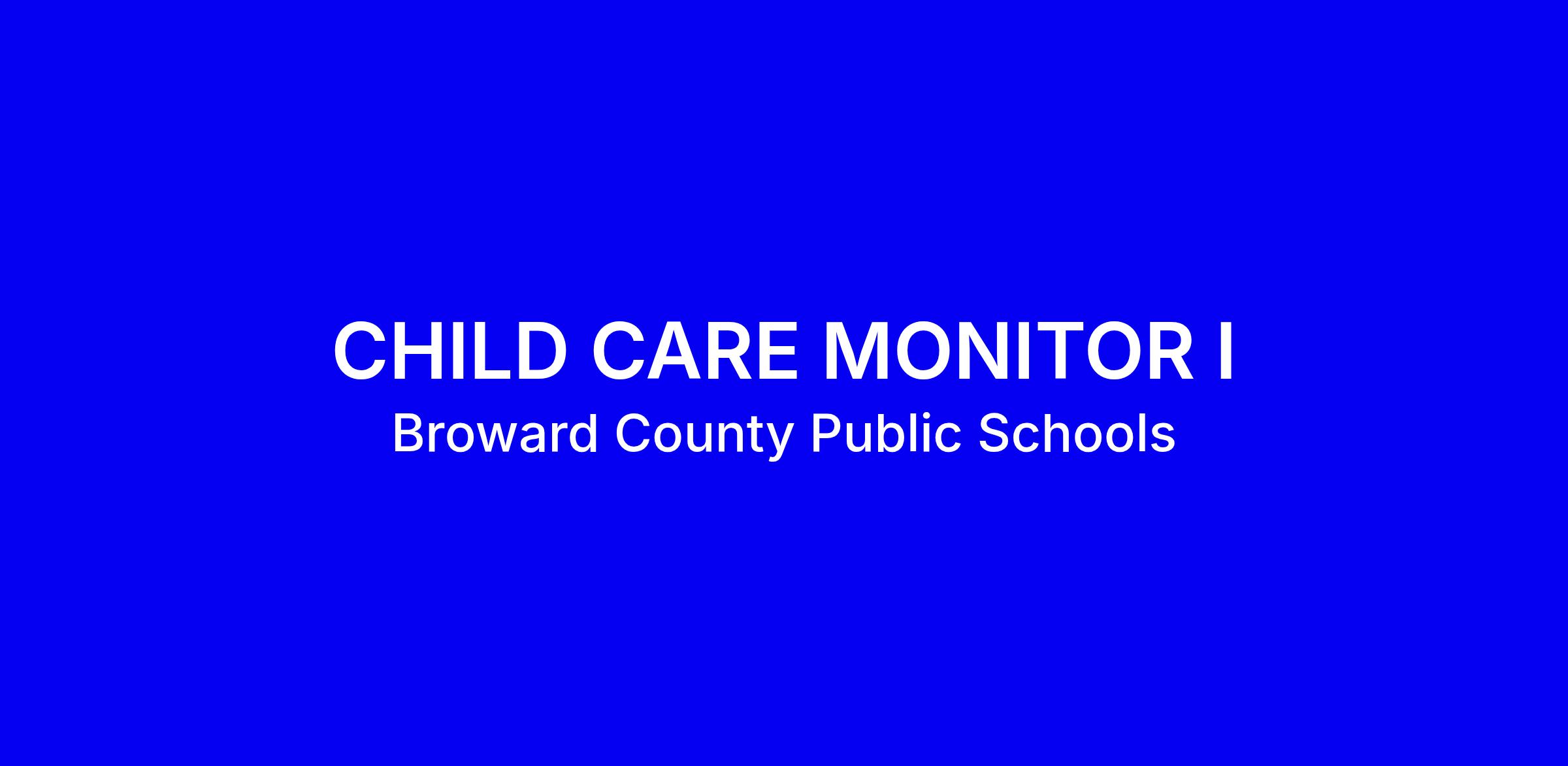 Broward County Public Schools is seeking a Child Care Monitor I for a full-time on-site role in Coral Springs to run planned activities that keep the Before and After School Care program safe and enriching. Applicants should have a high school diploma or GED and experience supervising school-age children in groups, plus a plan to complete required trainings within the first year either BASCC Components I and II or the Florida My Florida modules SNP 10 hours, UDAP 5 hours and SAP 5 hours. Must complete at least 10 hours of BASCC training annually, have computer skills, and be 18 or older. This is a temporary nonunion nonexempt hourly position. Reference job code KK-112 on the district site.