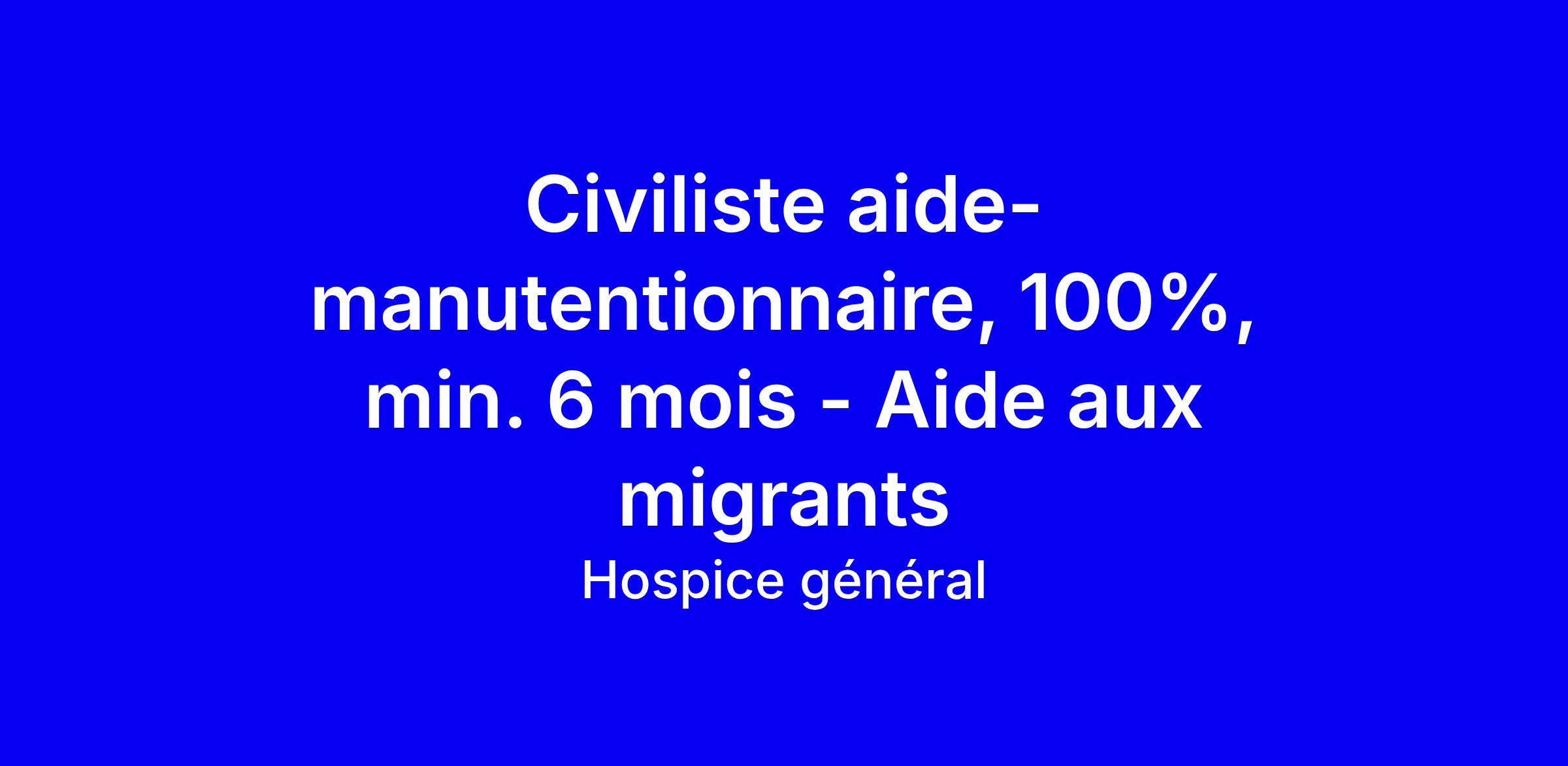 Cette offre d’Aide-manutentionnaire civiliste à l’Hospice général de Genève est un poste à 100 % pour au moins six mois, combinant transport de mobilier, gestion de stocks, animation avec des requérants mineurs, préparation et entretien des logements, petits travaux et livraisons. Le candidat idéal est physiquement apte, sait travailler en équipe et apprécie le contact direct avec des bénéficiaires dans un cadre multiculturel; la pratique de l’anglais est un atout et le permis B est souhaité. Important: avoir effectué les démarches auprès du service civil pour être reconnu civiliste. Pour optimiser votre candidature, mettez en avant vos expériences logistiques, votre polyvalence et votre engagement envers l’inclusion des migrants et des personnes en insertion.