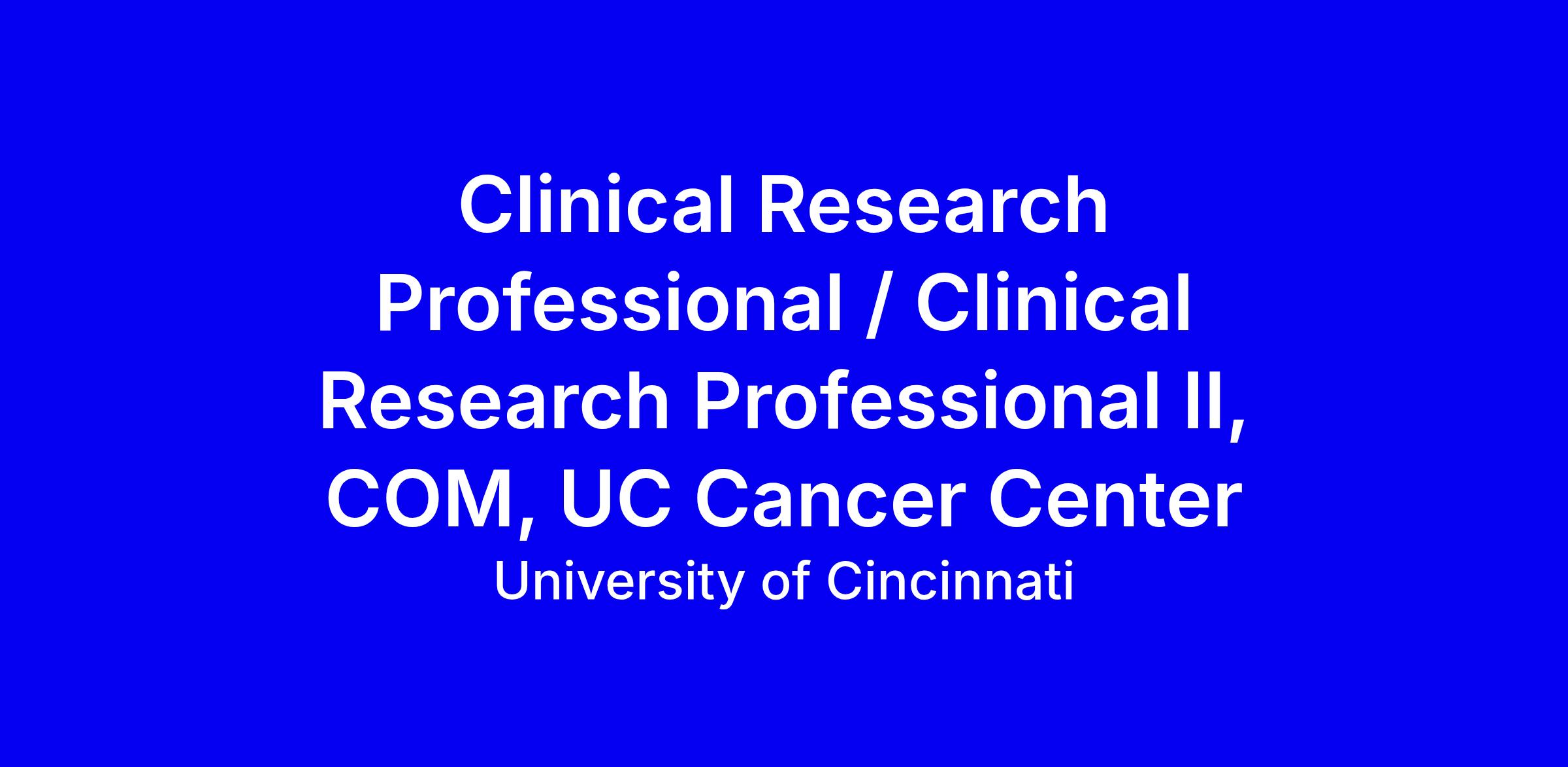 University of Cincinnati College of Medicine’s Cancer Center is hiring a Clinical Research Professional or Clinical Research Professional II for a full‑time, on‑site role supporting the Clinical Trials Office. This patient facing position covers consent, screening coordination, treatment visits, imaging and lab scheduling, data entry in Epic and study systems, regulatory documentation, and biospecimen handling, in collaboration with investigators, pharmacists, and clinical teams. CRP: related bachelor’s with 1 year experience (or 5 years in lieu). CRP II: related bachelor’s with 3 years (or 7 years in lieu). CRP certification required for patient facing work. Visa sponsorship not offered. Internal UC applicants must apply via SuccessFactors. Tips: tailor your resume to CTO workflows, highlight Epic/CTMS and RECIST, emphasize patient communication and teamwork.