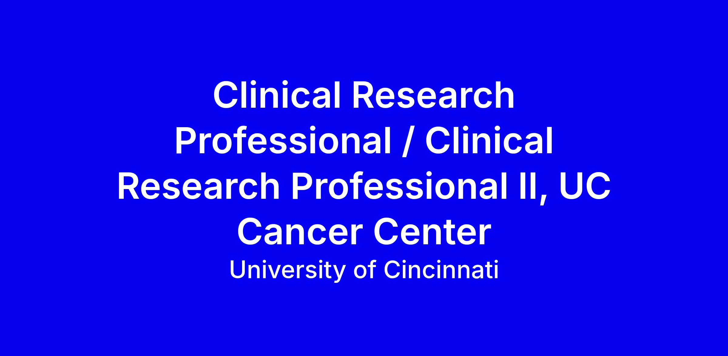 The University of Cincinnati Cancer Program is looking to fill a patient facing position as either a Clinical Research Professional or Clinical Research Professional II. This position will support the University’s mission and commitment to excellence in our students, faculty, staff and all our activities.
