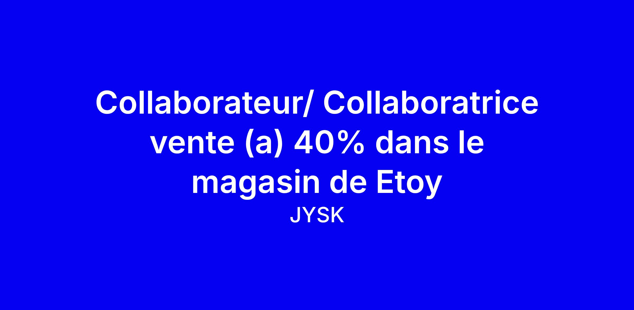 Ce poste de collaborateur/ collaboratrice vente 40% à Etoy chez JYSK recherche une personne passionnée par le service client et capable de travailler en équipe pour offrir la meilleure expérience d’achat. Tu seras responsable de la vente, veilleras à la propreté et à l’approvisionnement, aideras à la réception et au stockage et géreras de manière autonome ton secteur (par exemple matelas ou meubles). L’offre inclut formation et mentorat, concours internes, bonus sur le chiffre d’affaires, 20% de réduction, d’excellentes prestations de pension, 5 semaines de vacances qui augmentent avec l’ancienneté et des activités d’équipe. Pour postuler, mets en avant ton sens du contact, ton esprit d’équipe, ta capacité à évoluer dans un environnement dynamique et ta disponibilité le samedi via le lien dédié.