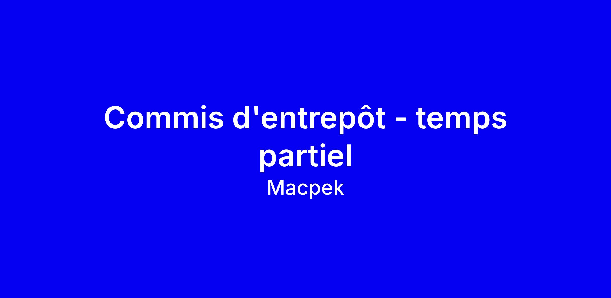 Macpek recherche un(e) commis d'entrepôt à temps partiel pour rejoindre une équipe dynamique, sur site à Québec. Vous gérerez la réception et l’expédition des produits, le tri et l’entreposage des pièces, la préparation des commandes et le chargement/déchargement des camions. L’équipe met l’accent sur une culture passion, respect, esprit d’équipe et travail, avec un salaire de 20,33 $ de l’heure. Horaires flexibles selon la période: 16 à 20 heures/semaine en période scolaire (soirs et fins de semaine) et jusqu’à 40 heures en été (lundi au vendredi). Pour postuler, mettez en avant votre expérience en entrepôt, votre capacité à travailler en équipe, et votre disponibilité en soirées et weekends.