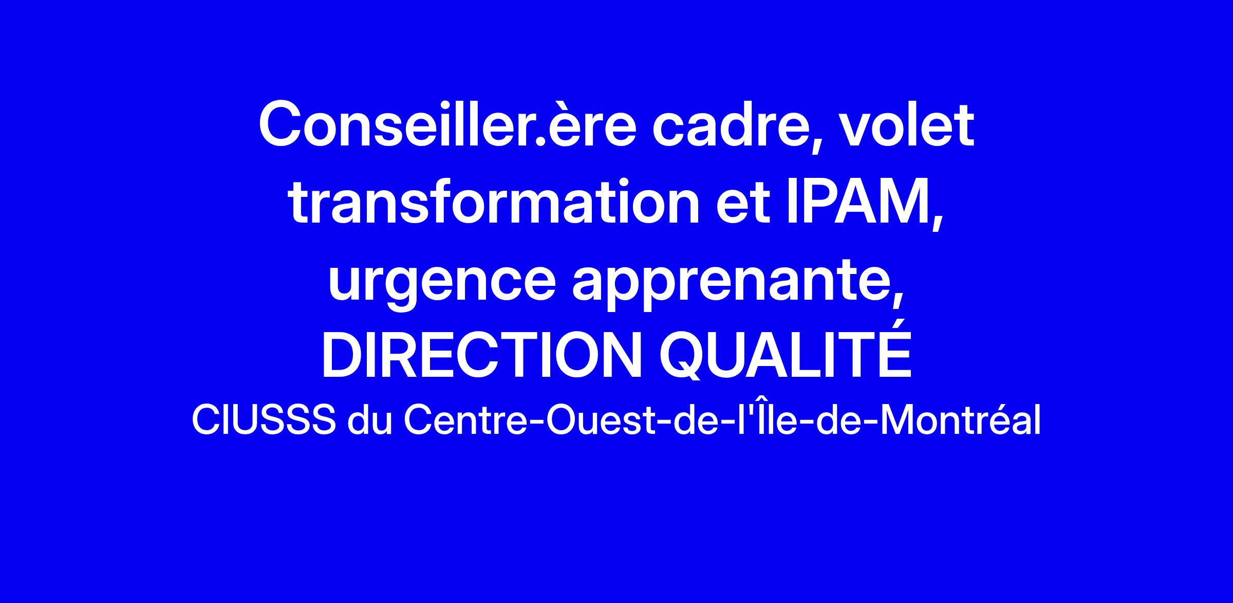 ***CONCOURS RÉSERVÉ AU PERSONNEL DU RÉSEAU DE LA SANTÉ ET DES SERVICES SOCIAUX (RSSS), SANTÉ-QUÉBEC, POUR UNE PÉRIODE INDÉTERMINÉE Le Centre intégré universitaire de santé et de services sociaux (CIUSSS) du Centre-Ouest-de-l’Île-de-Montréal est à la recherche d’un(e) Conseiller.ère cadre à la Direction de la qualité, transformation, évaluation, valeur et soins virtuels (DQTEVE&SV), volet transformation et IPAM, urgence apprenante.