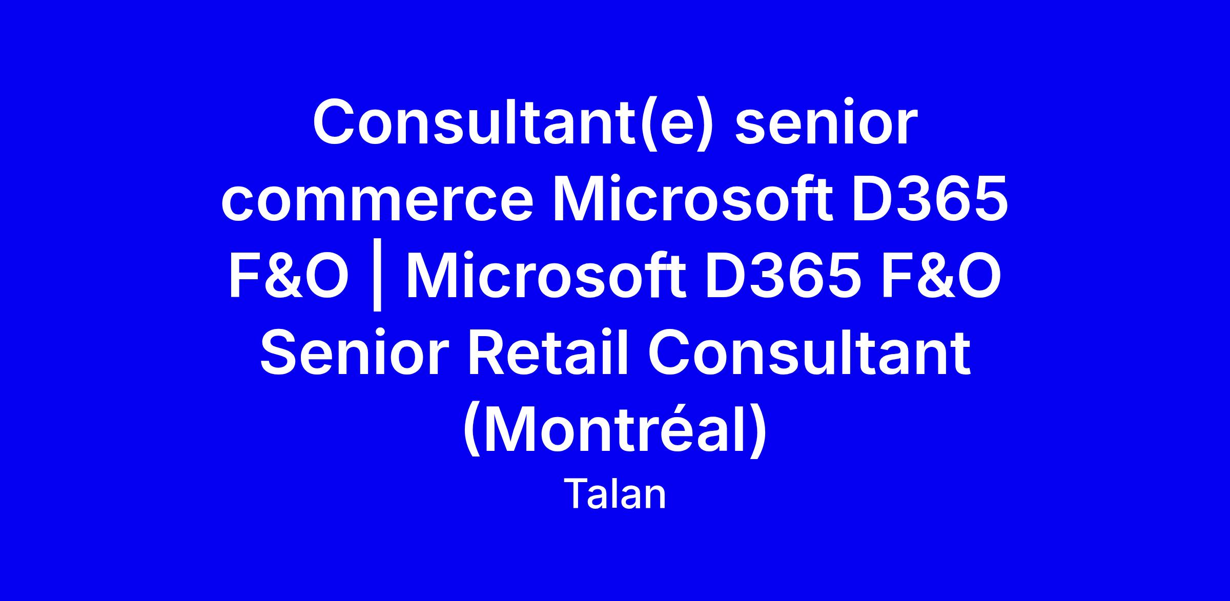 Poste: Consultant senior D365 F&O Commerce & Retail chez Talan, basé à Montréal avec relocalisation sur place. Vous rejoindrez l’équipe Microsoft pour accompagner des clients du retail dans l’implémentation, l’optimisation et la transformation des processus omnicanaux, du POS à la chaîne d’approvisionnement et à l’expérience client. Exige 10 ans d’expérience ERP/CRM dans le retail et une expertise sur D365 F&O et/ou D365 Commerce/Retail, avec une forte connaissance des enjeux omnicanal, tarification, promotions et fidélisation. Conseils: mettez en avant vos réalisations chiffrées, vos certifications D365 Commerce, et votre capacité à travailler en français et en anglais avec des équipes pluridisciplinaires; soyez prêt à voyager, à former et à documenter. Postulez vite.