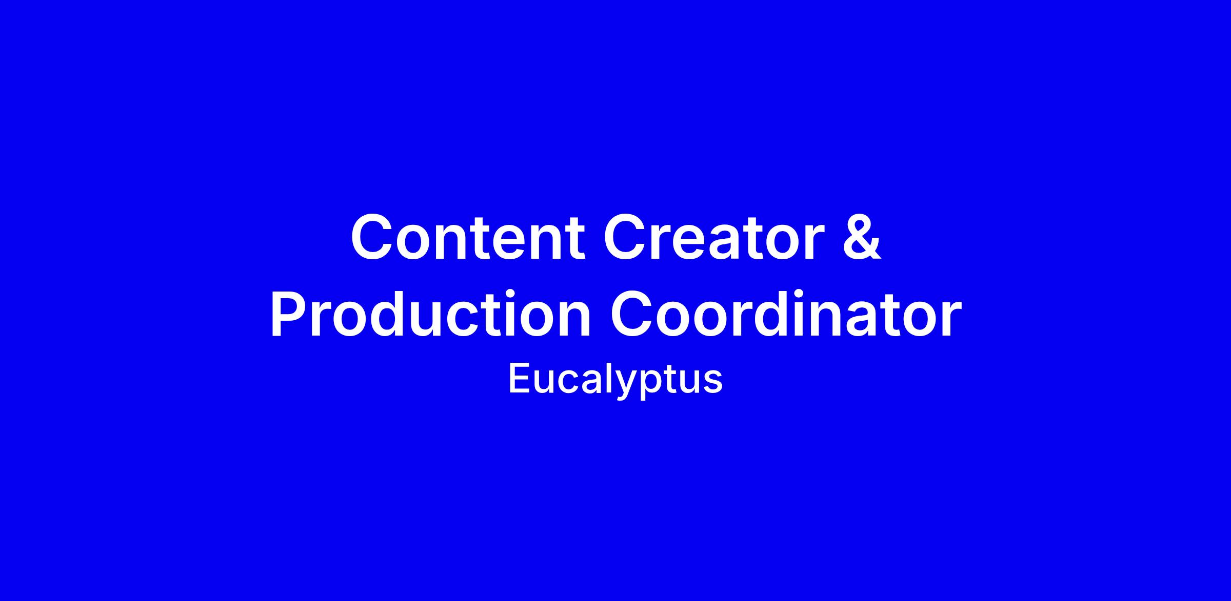 Eucalyptus is hiring a Content Creator & Production Coordinator for Juniper, a fast growing digital health brand in Sydney, full-time and onsite. You’ll be the backbone of content production, supporting the Production Lead with shoot schedules, talent briefs, asset management, and delivering native content for TikTok, Instagram Reels and Stories while always tracking trends and testing what works. You’ll split your time between coordinating production and creating platform-first content that resonates, with 2 to 4 years in production coordination or similar, plus a native creator mindset, being chronically online, organized, technically proficient, empathetic and commercially minded. To apply, showcase a portfolio that proves platform-native, performance-driven work, include impact metrics, and demonstrate alignment with women’s health and Euc’s mission.