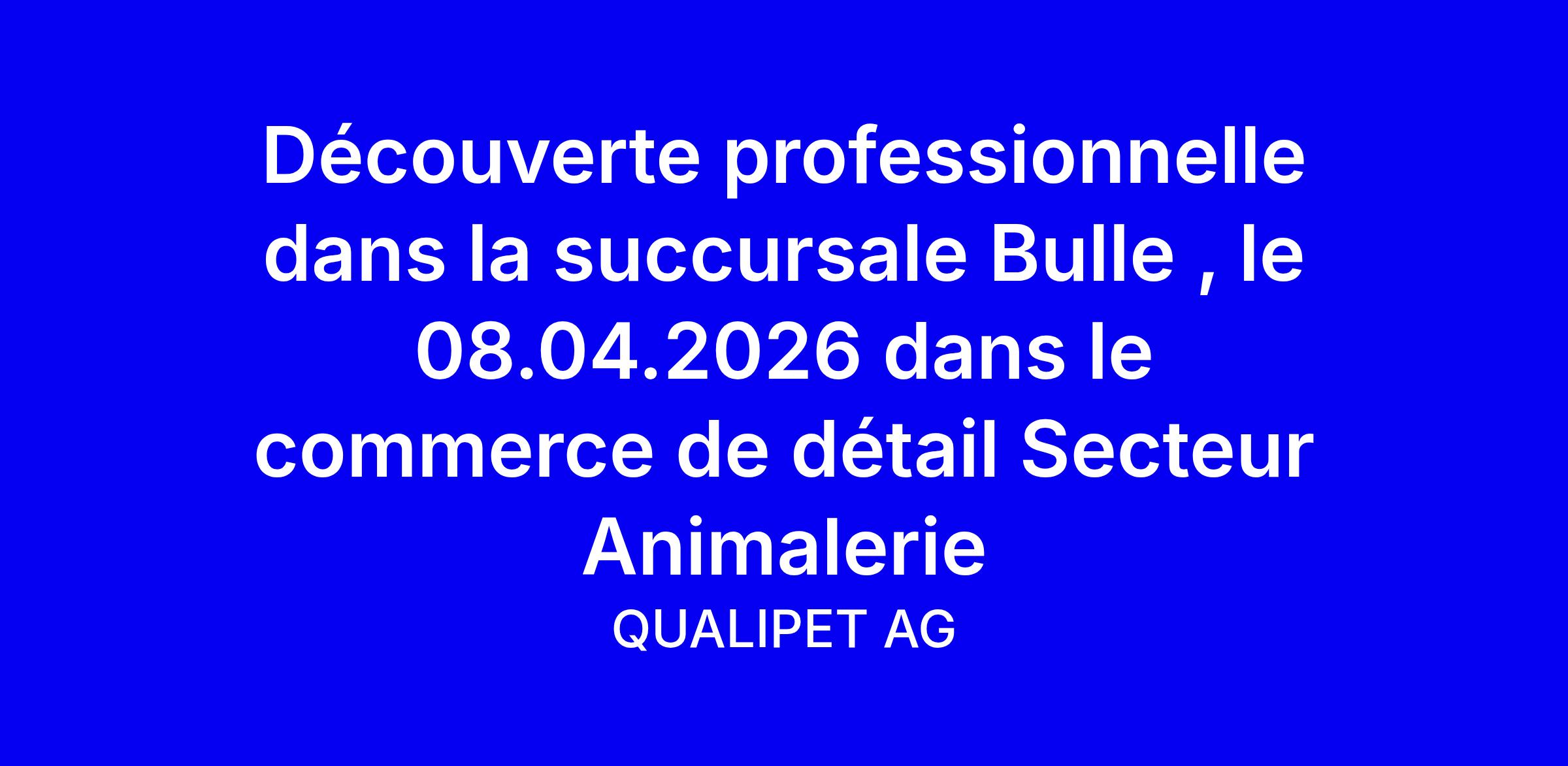 Qualipet AG invite les jeunes en seconde année de lycée à une découverte professionnelle dans la succursale de Bulle le 8 avril 2026, dédiée au métier de gestionnaire du commerce de détail dans le secteur animalerie. De 14h00 à 16h00, vous découvrirez les différents domaines d’activité, en collaboration avec nos formateurs et les RH, et vous pourrez poser vos questions sur l’apprentissage CFC ou AFP. Pour postuler, inscrivez-vous via le bouton Postuler et préparez une brève présentation de votre motivation et de votre intérêt pour les animaux. Mettez en avant le sens du service client, la curiosité pour le monde animal et l’esprit d’équipe; avantages attractifs et taux d’embauche élevé après formation.