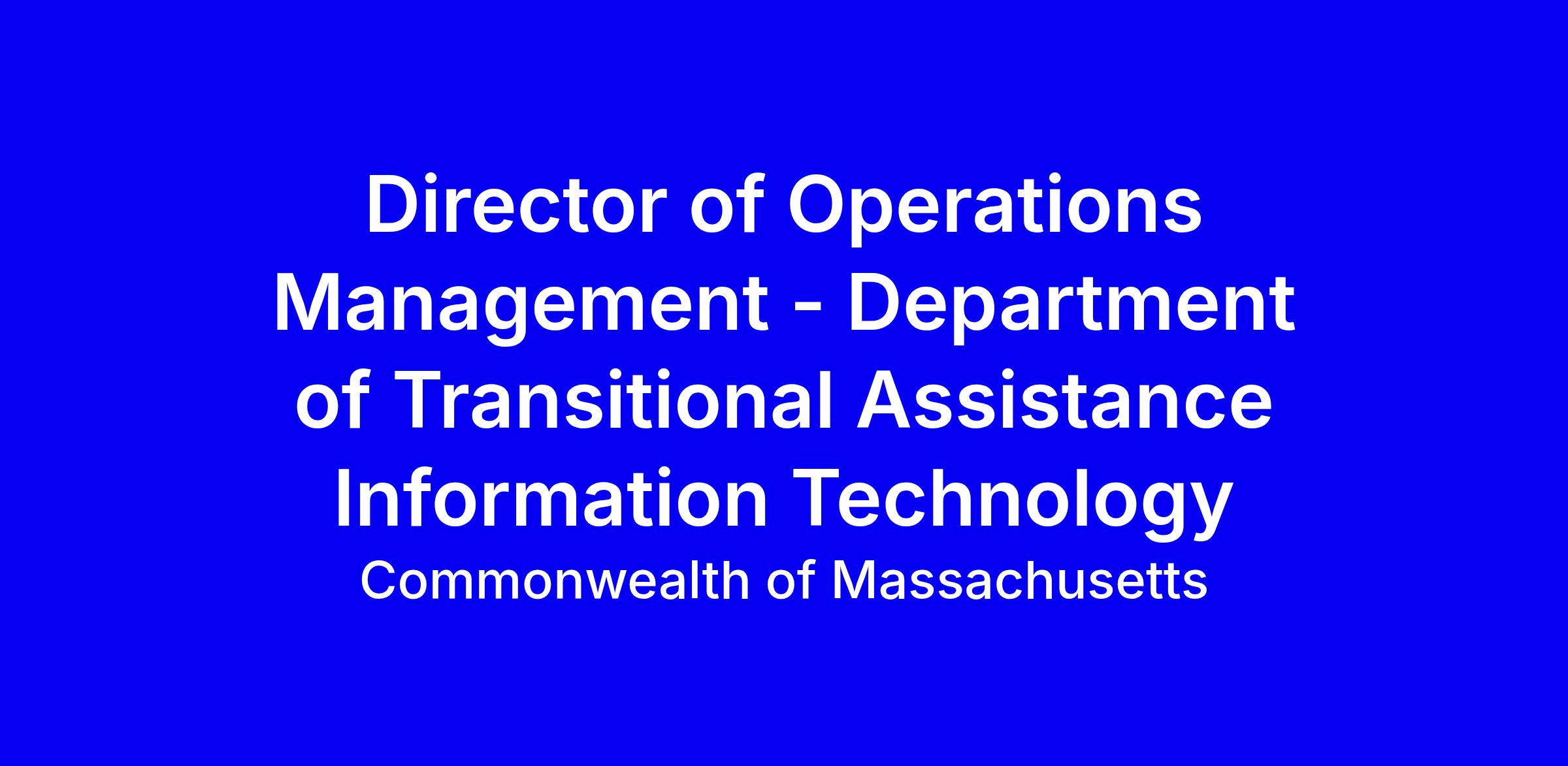 The Commonwealth of Massachusetts is seeking an exceptional individual to join the Executive Office of Health and Human Services Information Technology (EOHHS IT) Team as the Director of Operations Management – Department of Transitional Assistance Information Technology (DTA IT). The Director of Operations Management – DTA IT will report directly to the Assistant Chief Information Officer (ACIO) for DTA and will oversee and supervise the technology team at DTA IT, lead in the creation and implementation of technology roadmaps, and manage the enterprise systems for DTA. This is an exciting opportunity to join a highly skilled and visible team within the Executive Office of Health and Human Services.