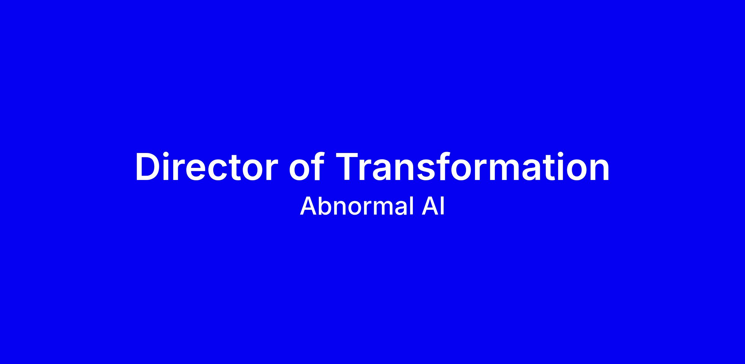 As our Director of Transformation, you’ll build and lead a small, high-impact team that acts as the “tip of the spear” for AI transformation across the business. You’ll work directly with the Chief People & Transformation Officer, CFO, CEO, and Chief of Staff to identify high-value opportunities for transformation, scope business problems, and partner with our R&D pods to prioritize and deliver solutions. You’ll also design the future of human work at Abnormal—defining how roles, teams, and systems adapt as automation unlocks new ways of operating.