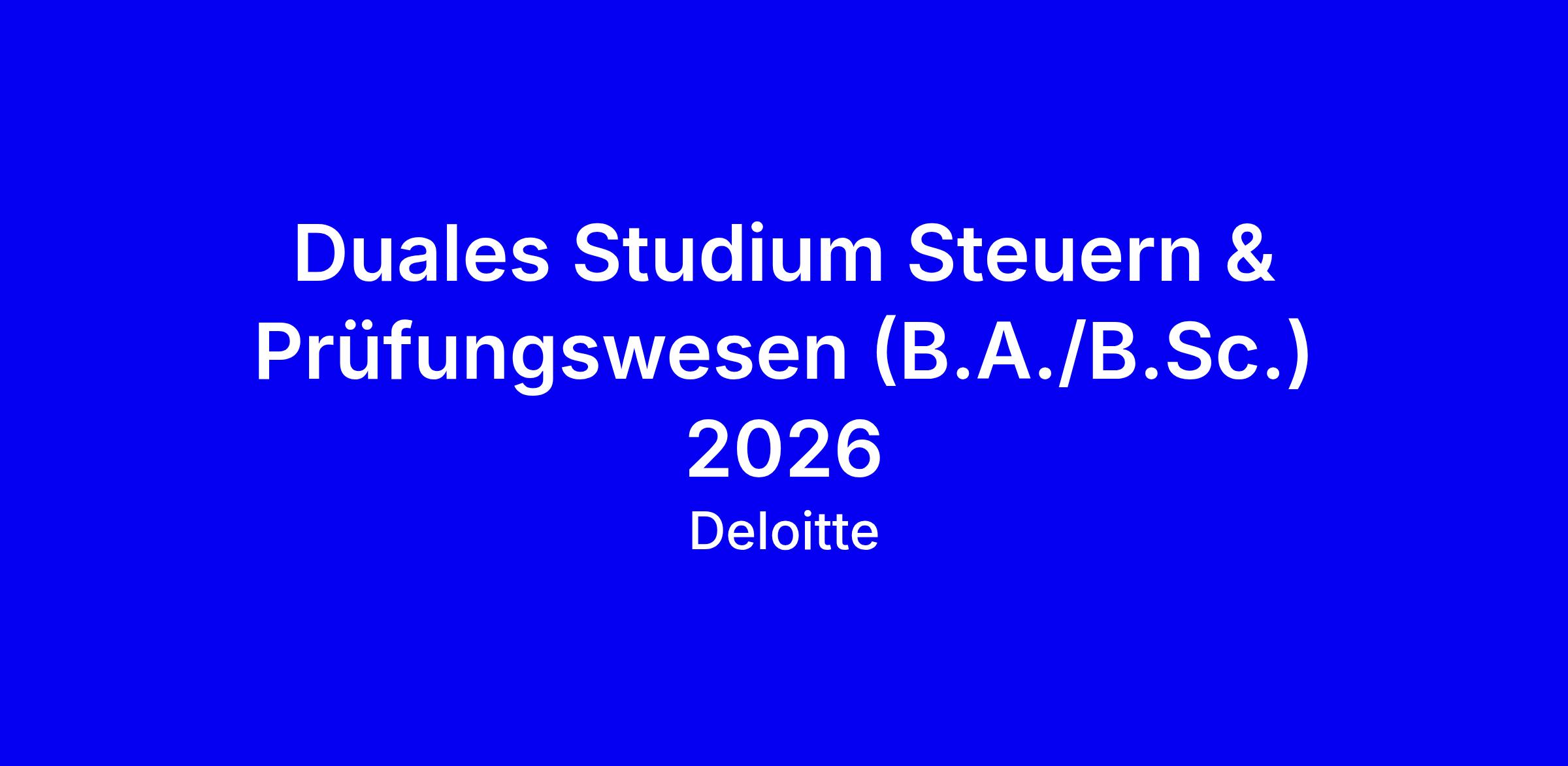 Du willst mit einem 3-jährigen dualen Studium den Grundstein für deine Karriere legen und vollwertiges Teammitglied im Bereich Tax & Legal werden? Starte zum 1.10.2026 dein duales Studium Steuern & Prüfungswesen (B.A./B.Sc.) bei Deloitte und einer unserer Kooperationshochschulen DHBW Mannheim oder DHBW Villingen-Schwenningen.