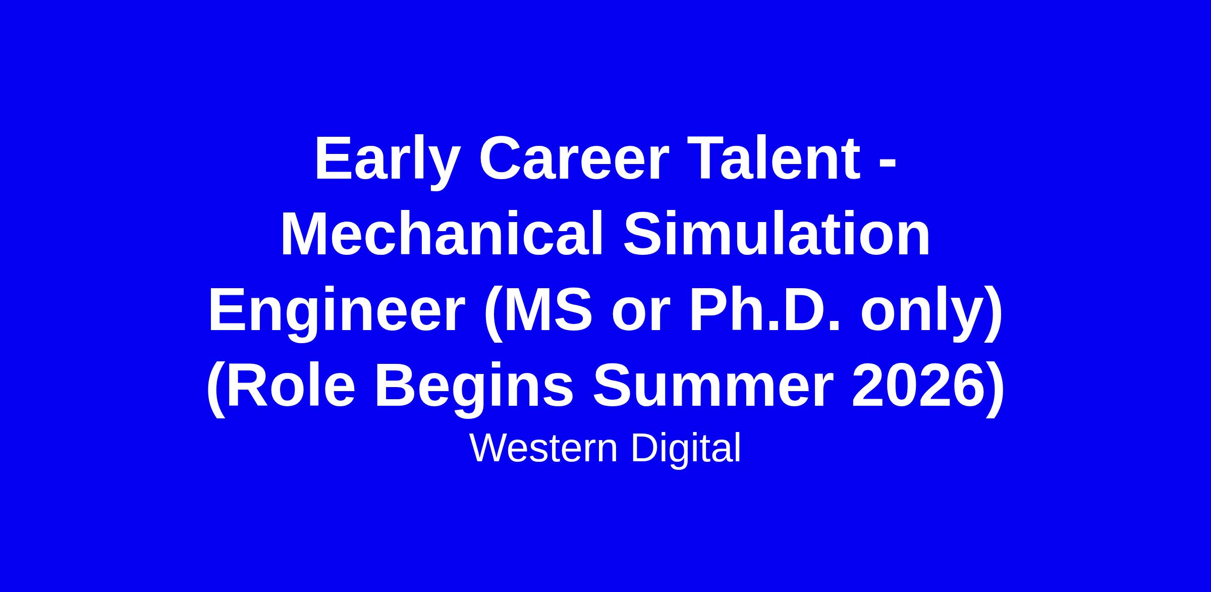 Western Digital seeks an Early Career Mechanical Simulation Engineer (MS or PhD, summer 2026 start) to join a San Jose team. The role centers on simulating HDD servo systems with FE methods (stability, dynamics, electromagnetics, vibro-acoustics, CFD), validating results via correlation experiments, and partnering with design engineers to optimize products. Ideal candidates hold an MS or PhD in Mechanical Engineering with at least a 3.0 GPA and bring hands-on experience in ANSYS, HyperWorks, Matlab, SolidWorks, plus lab work with Laser Doppler Vibrometers and oscilloscopes. Strong communication and collaboration are essential; ML knowledge is a plus. To apply, tailor your resume to FE analyses and cross-functional impact and note your Early Career interest and onsite availability in San Jose.