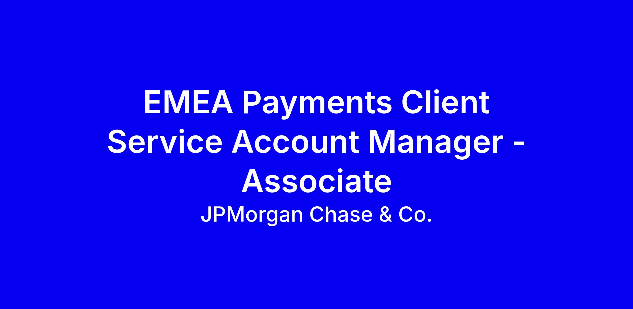 JPMorgan Chase & Co is seeking an EMEA Payments Client Service Account Manager - Associate in Zurich to be the client’s champion, delivering best-in-class service, leading regular service reviews, and building deep relationships to drive 100% client satisfaction and growth. You will understand the client’s business, anticipate needs, promote electronic service tools, analyze end-to-end payment processes, and coordinate cross-functional teams to improve operations and mitigate risk. Fluent English and German are required; French or Italian is a plus. To apply, highlight proven relationship management, multi-stakeholder collaboration, and process optimization, plus a genuine interest in digital banking transformation and a commitment to diversity and inclusion.