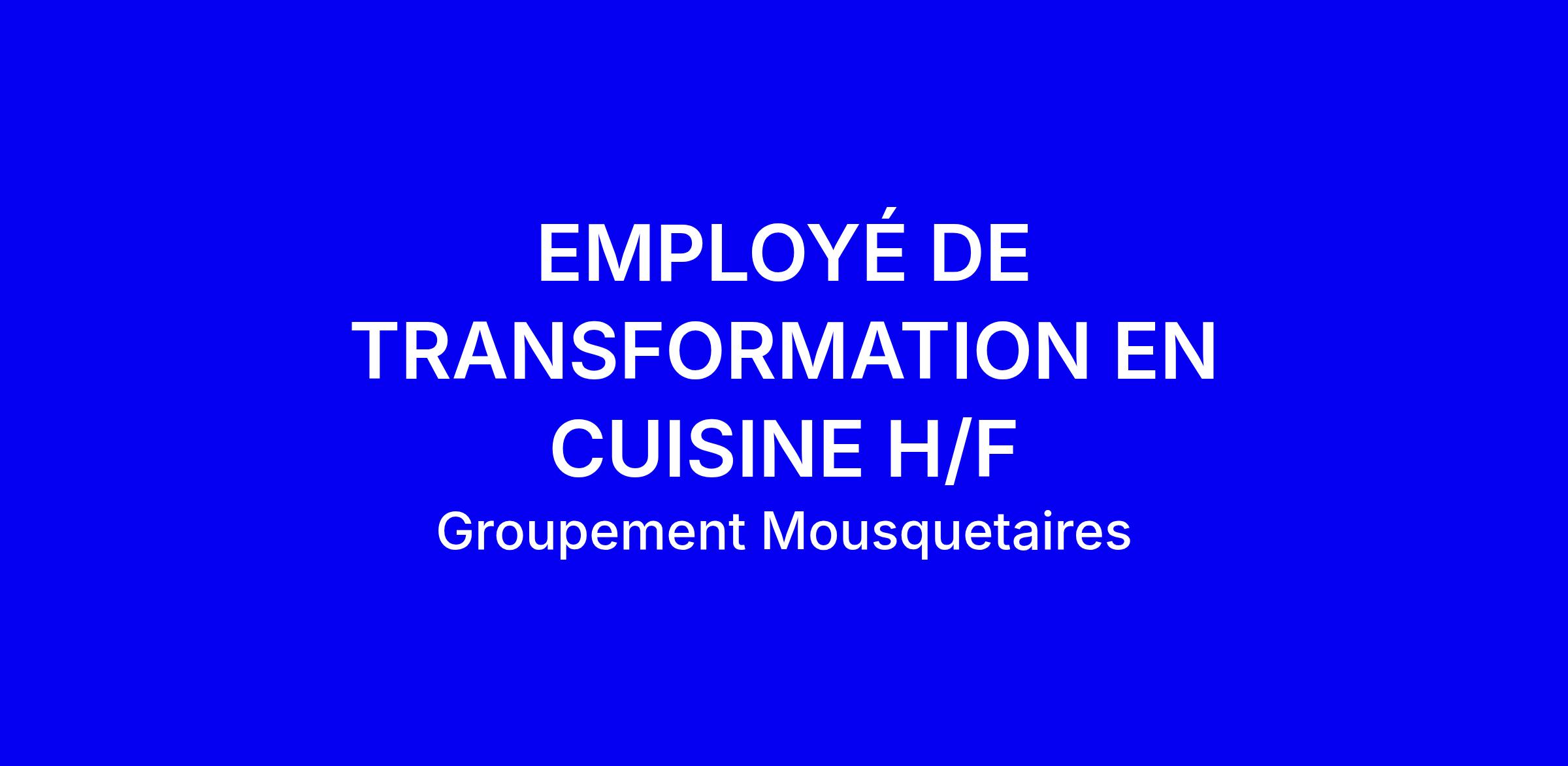 Intermarché, groupe Mousquetaires, recherche un employé de transformation en cuisine H/F en contrat d'apprentissage 36h45 sur site. Tâches: découpe de fruits et légumes, élaboration de plats cuisinés selon les fiches recettes, emballage des produits, nettoyage du laboratoire et respect des normes d’hygiène, de sécurité et de traçabilité. Une première expérience dans l’alimentaire (cuisinier en restauration, traiteur) est souhaitée pour maîtriser rapidement les gestes. Ce poste s’inscrit dans une démarche d’insertion durable des jeunes et offre une réelle opportunité d’apprentissage. Pour postuler, adaptez votre CV et lettre, mettez en avant votre rigueur, votre sens du travail en équipe et votre capacité à suivre les procédures.