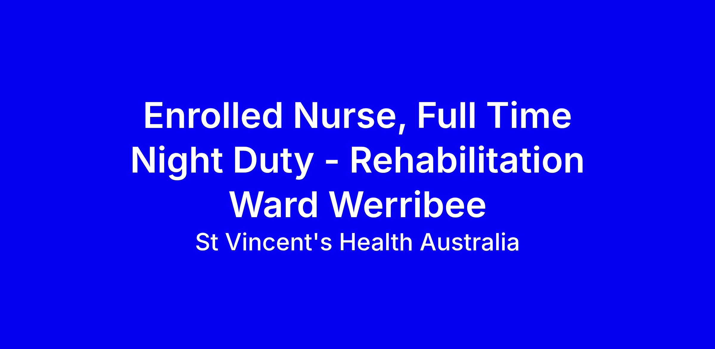 St Vincent’s Private Hospital Melbourne, Werribee campus, is seeking an Enrolled Nurse for full time night duty in the Rehabilitation Ward. You will join a not-for-profit Catholic health system that prioritises patient experience, collaborative care and ongoing professional development across SVHA sites. The role supports rehabilitation for post-operative orthopaedics, neurosurgery and reconditioning, so prior rehab and acute surgical‑orthopaedic nursing is essential. Key qualities include AHPRA registration, patient‑focused care, strong interpersonal and problem-solving skills, and the ability to work under pressure within a multidisciplinary team. Benefits include salary packaging, Fitness Passport discounts, Give4Good and extra leave options. Apply with a cover letter and resume by 20 March 2026; for questions contact Dusica Delic, Nurse Unit Manager, on 03 9218 8257.