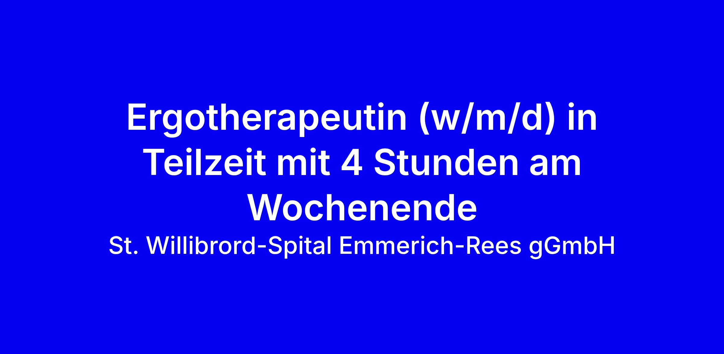 Die Stelle richtet sich an eine Ergotherapeutin oder einen Ergotherapeuten (w/m/d) in Teilzeit mit 4 Wochenstunden am Samstagvormittag am St. Willibrord-Spital Emmerich-Rees gGmbH. Zu Ihren Aufgaben zählen der Mini-Mental-Status-Test, der Uhrentest und die Geriatrische Depressionsskala bei geriatrischen Patientinnen und Patienten. Es handelt sich um eine geringfügige Beschäftigung (450€-Basis). Das Krankenhaus bietet ein Vereinbarkeitskonzept, flexible Arbeitszeiten, familienfreundliche Angebote, eine attraktive außertarifliche Vergütung sowie Zusatzleistungen wie Jobrad und Corporate Benefits. Weiterbildungen gibt es inklusive 24 Stunden pro Jahr Berufspädagogik. Bewerbungen willkommen, betonen Sie Patientenorientierung, Teamfähigkeit, Selbstständigkeit und Flexibilität; Berufsanfänger sind willkommen. Kontakt: Frau Catherine Maiworm-Darnand, 02822/736231.