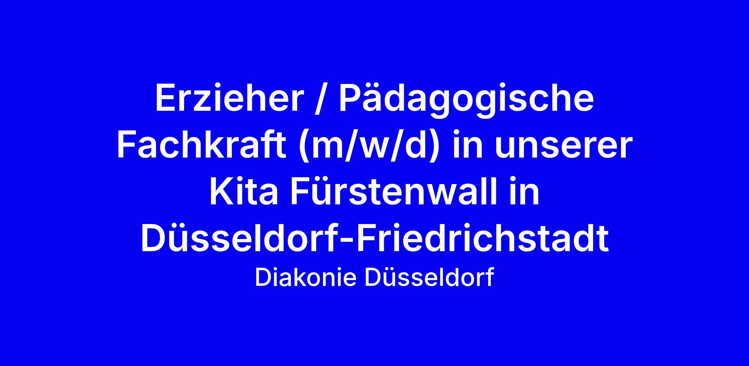 Die Diakonie Düsseldorf sucht für die Ev. Tageseinrichtung Fürstenwall in Düsseldorf-Friedrichstadt eine/n Erzieher/in bzw. pädagogische Fachkraft (m/w/d) in Vollzeit. In vier Gruppen betreuen Sie Kinder von zwei Jahren bis zum Schuleintritt und arbeiten an den Schwerpunkten Bewegung, Ernährung und Musik; die Kita ist als Familienzentrum NRW zertifiziert und gut an den ÖPNV angebunden. Die Stelle ist unbefristet, das Gehalt orientiert sich an BAT-KF in SE 8a und liegt aktuell etwa zwischen 3.415 und 4.542 Euro brutto monatlich. Voraussetzungen: staatlich-anerkannter Erzieher oder vergleichbarer Abschluss oder Hochschulstudium in Erziehungswissenschaften; Offenheit für religions- und gemeindepädagogische Arbeit; Bewerbungen von Menschen mit Behinderungen vorrangig. Bewerben Sie sich über den Link, nennen Sie konkrete Beispiele aus der Praxis und verweisen Sie auf LVR-anerkannte Qualifikationen; Kontakt: Patrick Guttek.
