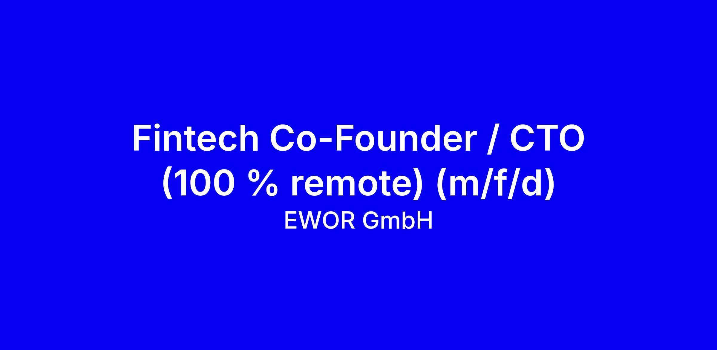 EWOR GmbH is seeking ambitious entrepreneurs for a 100% remote Fintech Co-Founder/CTO role, offering salary or up to €500k funding, weekly sparring with unicorn founders, and access to a network of founders and investors. You will own and run a fintech startup, receive a tailored personal development program, and get hiring, coaching, and go-to-market support to drive PMF and multi-million euro funding rounds within 12 months. To apply, show a track record of taking full ownership, a clear plan to scale to €100M+ in revenue, strong English, and readiness to relocate or work remotely in Europe or the Americas, plus how you will build a €1B+ company with us.