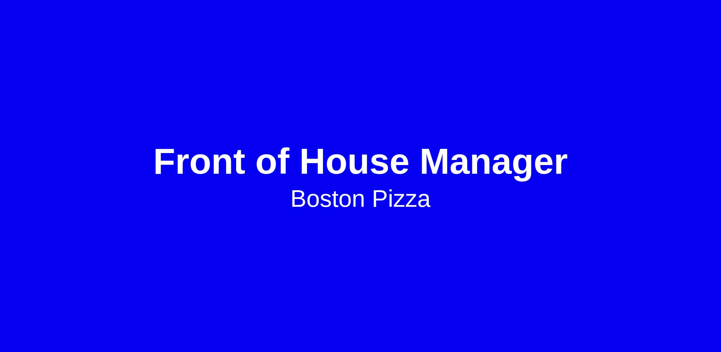 A Front of House Manager at Canada's leading casual dining restaurant, Boston Pizza, assists the General Manager with the Restaurant’s daily operations. This includes supporting the training, development, staffing, scheduling, and performance management of the Front of House team members. The Front of House Manager supports the team to ensure that our most important people, our Guests, and team members, have an excellent Boston Pizza experience from start to finish. They also demonstrate outstanding leadership abilities, believe in championing a fun and safe work environment, and contribute to thriving workplace culture.