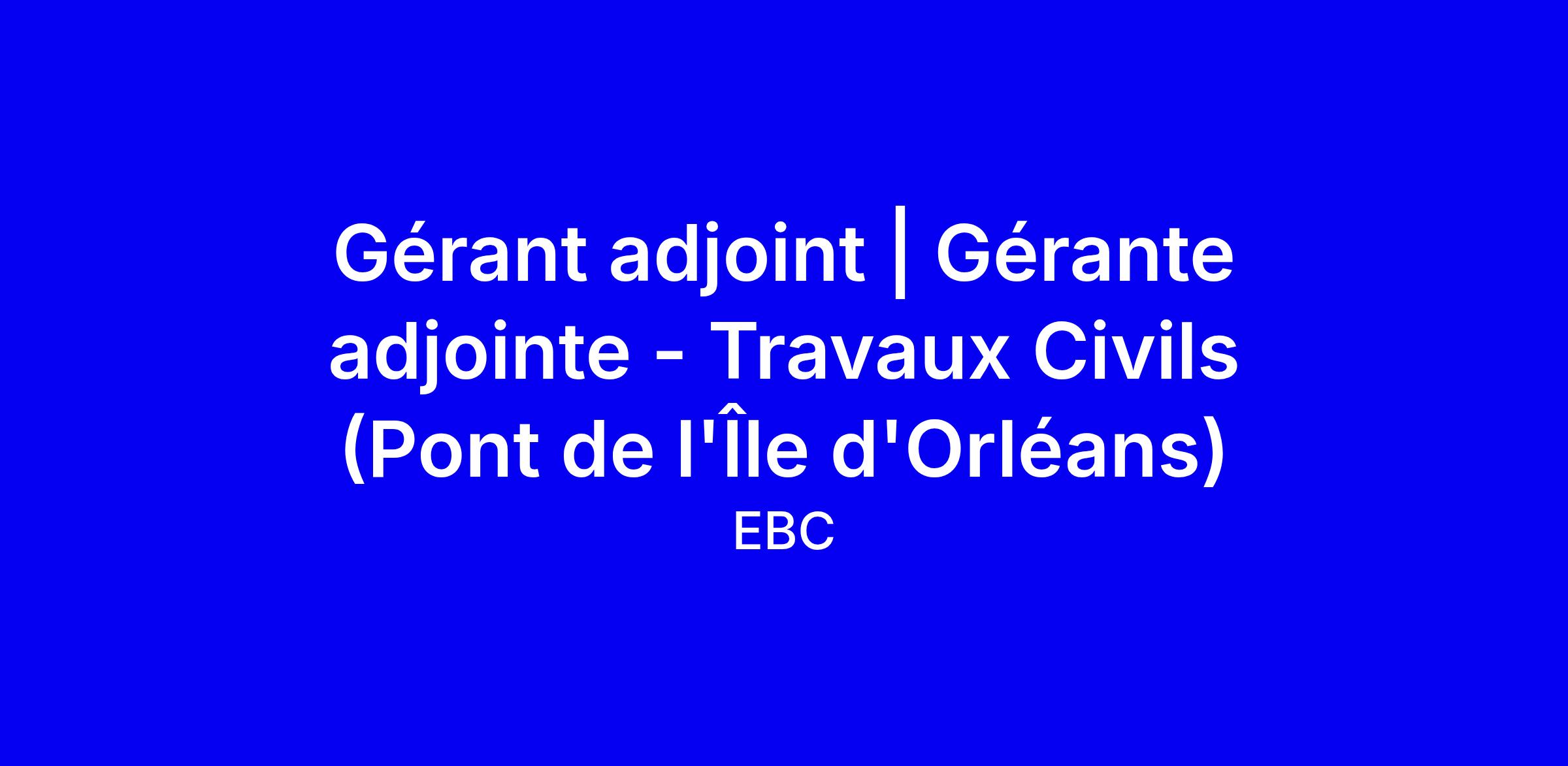 EBC recrute un/une Gérant adjoint pour les Travaux Civils sur le projet Pont de l'Île d'Orléans, chargé de superviser les approches Nord et Sud, les liens routiers et les travaux de démolition reconstruction et raccordement à l’île. Vous assurerez le suivi des coûts, encadrerez les ingénieurs et coordonnateurs de chantier, négocierez et préparerez les contrats et commandes, gérerez les changements avec le client et les décomptes, et planifierez les travaux. Exigences: baccalauréat en génie civil ou construction, 5 ans d’expérience en gestion de projets, maîtrise MS Office et MS Project ou Primavera P6, connaissance Autodesk, expérience BIM un atout, bilinguisme anglais/français. Avantages: salaire compétitif, 4 semaines de vacances, assurances, REER, formation continue.