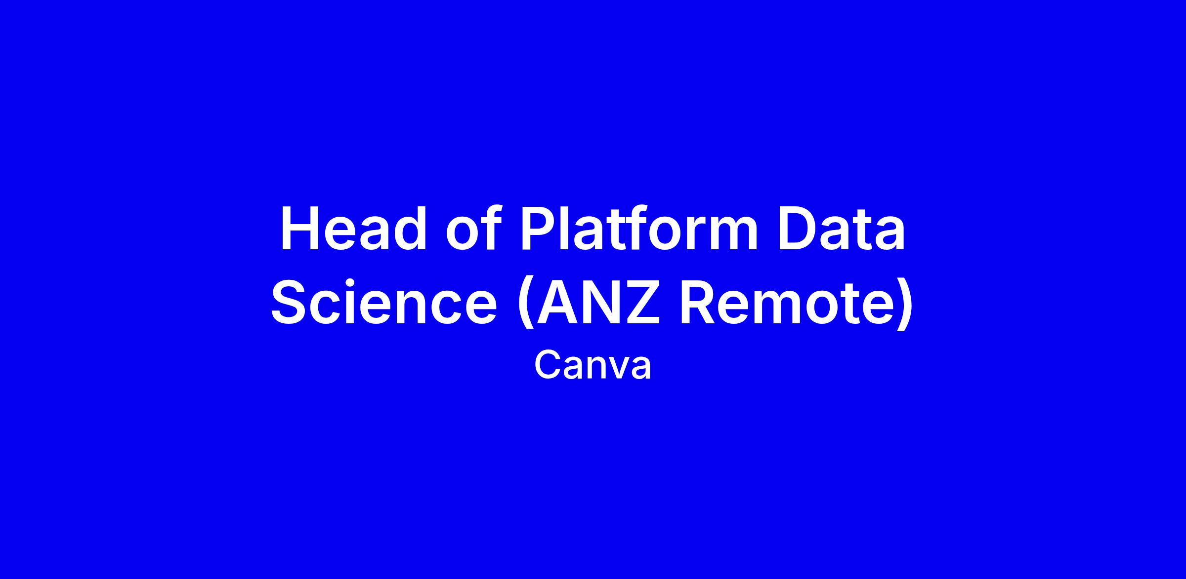 Canva is seeking a Head of Platform Data Science (ANZ Remote) to lead about 20 data professionals across Product Platform Data, Infrastructure Data and Central Data Science, shaping Canva’s platform data strategy and owning the Experimentation Platform roadmap. The role drives technical excellence, data informed decision making on performance and reliability, and leads analytics that scale to billions of users while enabling AI investments for cost optimization and observability. You should have a proven track record leading high performing data teams, shaping roadmaps with engineering and product, deep knowledge of experimentation platforms and automation, and strong cross audience communication. In your application, share measurable outcomes, multi team delivery, and alignment with Canva’s collaborative culture; mention pronouns and accessibility needs.