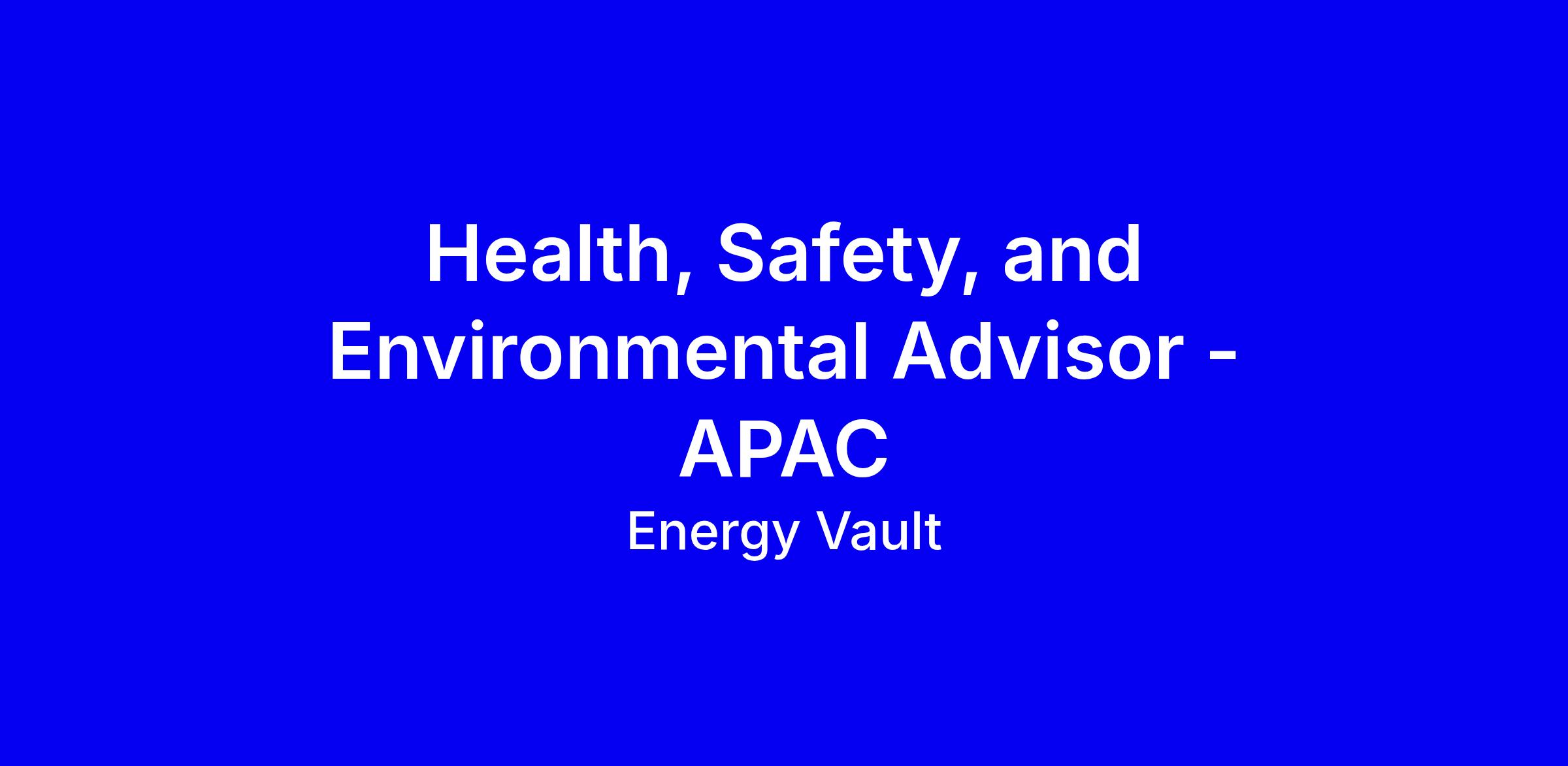 Our CompanyWelcome to Energy Vault® (NYSE:NRGV), a global energy storage and power infrastructure company focused on owning, operating, and enabling resilient, dispatchable energy assets. Energy Vault’s focus is to deliver reliable, flexible power that supports the evolving needs of modern grids, communities, and large energy users. Since 2024, the Company has centered its strategy on an Independent Power Producer (IPP) model, developing, building, owning, and operating critical energy assets around the world. Energy Vault operates globally, with headquarters in Westlake Village, California and Lugano, Switzerland, and regional development across North America, Europe, Asia, and Australia. The Company partners with utilities, grid operators, and large energy consumers to deliver infrastructure that strengthens grid reliability, enables renewable integration, and supports long-term energy security. By combining asset ownership with advanced technologies and integration expertise, Energy Vault is building the next generation of critical energy infrastructure, delivering dependable power when and where it matters most. Learn more at www.energyvault.com, explore recent updates in our Newsroom, and connect with us on LinkedIn, X, Facebook, Instagram, Vimeo, or YouTube. Our Values We Commit: To Building a Better Future for Earth and All Its Beings.We Innovate: Cutting Edge Solutions to Accelerate the Unique Energy Aspirations of Our Clients.We Connect: To Build Genuine Relationships.We Deliver: Going Above & Beyond by Being Fast & Nimble.We Lead: With Authenticity and Purpose.Your Impact as a Health, Safety, and Environmental Advisor - APAC: You will oversee project implementation of the Energy Vault Health, Safety, and Environment (HSE) Management System (MS) and project-specific HSE MP’s. This includes related policies, procedures, guidelines and work practices. You will manage compliance with Energy Vault requirements, applicable legislation, regulations, codes and standards, as well as with company objectives and targets. Utilizing your HSE experience in renewable energy and on construction sites of electrical facilities, you will assist the project team to ensure the requirements of the Workplace/Site HSE Rules are implemented and, where required, stop work to enable unsafe conditions or potential for harm to the environment to be rectified. You will spend your working hours, Monday through Friday, on the construction site close to Horsham, Vic. This fixed term role will be for the duration of the project, estimated 12-18 months, with possible extension or conversion to permanent.