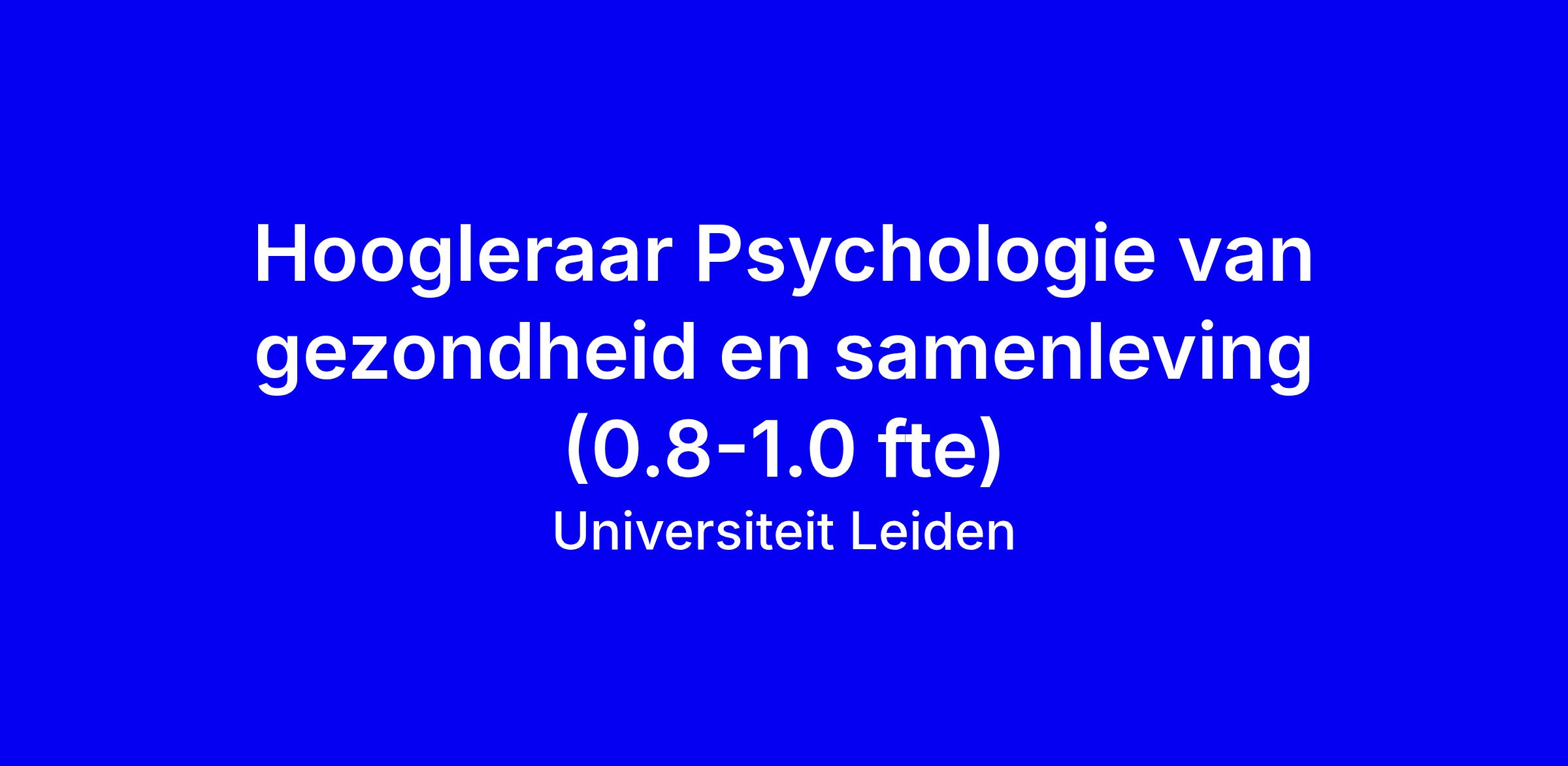 Universiteit Leiden zoekt een gezaghebbend en verbindend hoogleraar Psychologie van Gezondheid en Samenleving (0.8-1.0 fte) die richting geeft aan onderzoek, onderwijs en strategische positionering op het kruispunt van medische psychologie en maatschappelijke context. Je hebt een internationaal erkend onderzoeksprofiel binnen gezondheids- en medische psychologie, met aantoonbare expertise in biopsychosociale mechanismen bij chronische aandoeningen, een sterk publicatierecord en ervaring met het binnenhalen van externe middelen. Je ontwikkelt en leidt een geïntegreerd onderzoeksprogramma, initieert interdisciplinaire, data-intensieve projecten en versterkt samenwerkingen met faculteiten, Health Campus Den Haag en Medical Delta. Je draagt bij aan bachelor, master en promovendi onderwijs en vervult bestuurlijke rollen, met aandacht voor Open Science en inclusie. Solliciteer uiterlijk 1 mei 2026; benadruk concreet leiderschap, netwerken en impact.