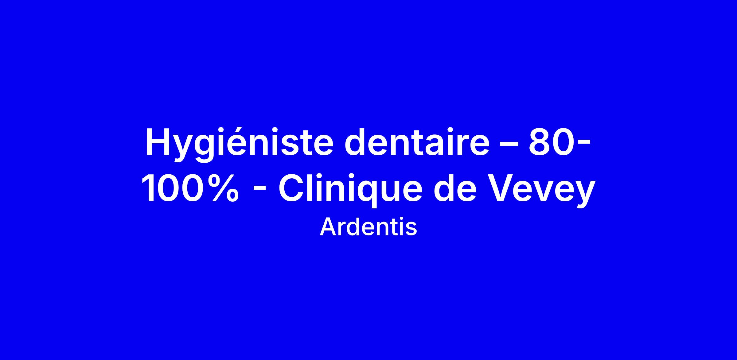 Ardentis cherche un(e) Hygiéniste dentaire en CDI à 80-100 % pour la Clinique de Vevey, prise de poste prévue mars 2026, sur le site Rue du Collège 3. Le poste exige un diplôme suisse d’hygiéniste dentaire ou titre reconnu par la Croix-Rouge Suisse, une maîtrise du français C1 (DELF/DALF), ainsi que des compétences avec Dentagest et les outils usuels (Word, Excel, Outlook) et la gestion des dossiers et du tarif. Profil recherché : présentation soignée, sourire, organisation, polyvalence, ponctualité, autonomie, aisance relationnelle et sens du service. Avantages : intégration personnalisée, formations, primes, 6 semaines de vacances. Pour postuler, adaptez CV et lettre, mettez en avant votre expérience patient et votre maîtrise informatique, et démontrez votre esprit d’équipe et votre appétence pour l’innovation chez Ardentis.