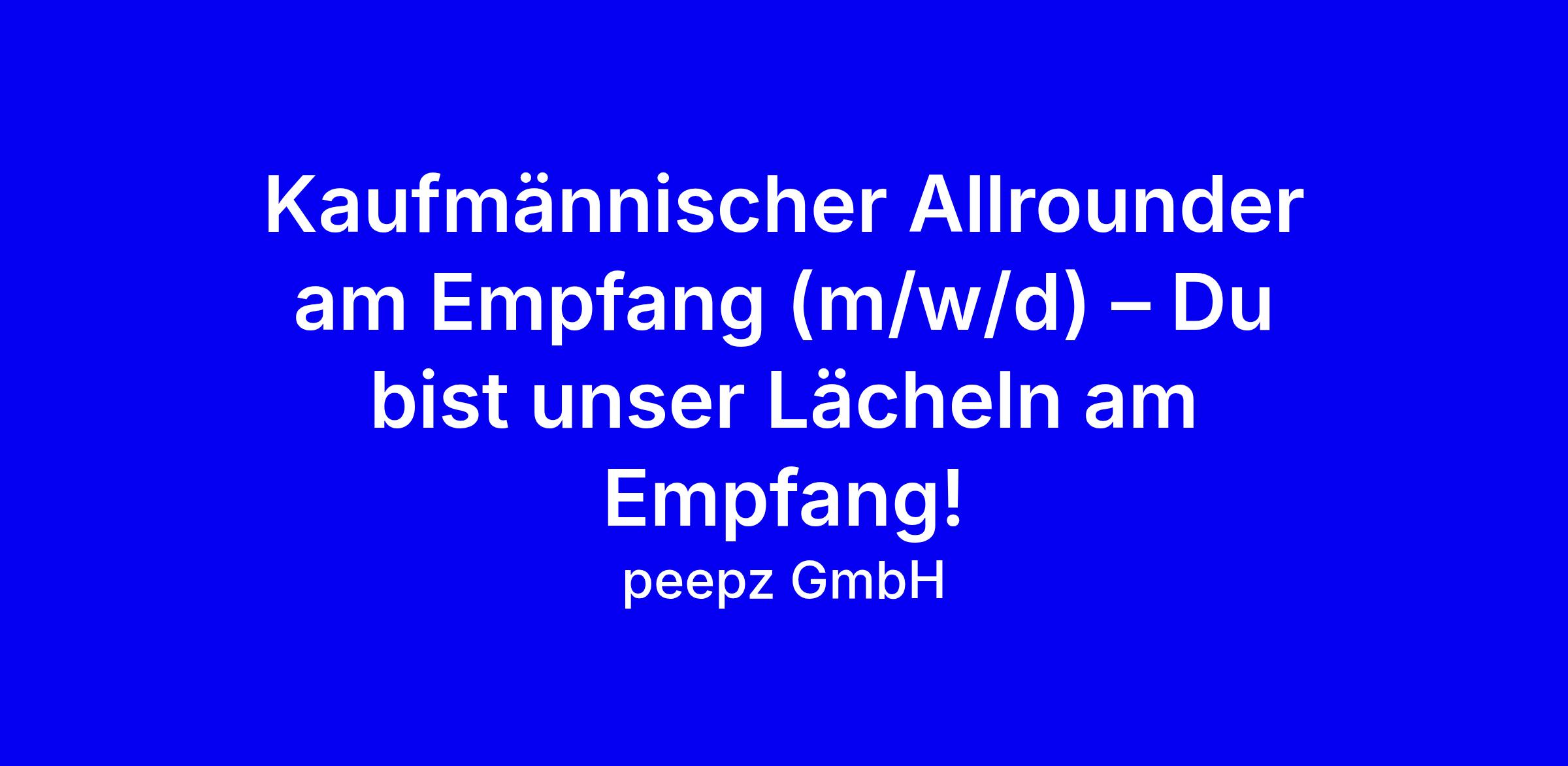 Bei peepz GmbH in Dresden suchen wir einen freundlichen kaufmännischen Allrounder am Empfang (m/w/d), der den ersten Eindruck wie in der Hotellerie gestaltet. Zu Deinen Aufgaben gehören Empfang und Betreuung, professionelle Telefon- und E-Mail-Korrespondenz, Koordination von Terminen und Meetingräumen sowie administrative Unterstützung. Wir bieten ein motiviertes Team, einen modernen Arbeitsplatz, flache Hierarchien, Entwicklungsmöglichkeiten und eine gute Work-Life-Balance mit flexiblen Arbeitszeiten von Mo bis Fr 08:00 bis 18:00. Ideales Profil: Herzlichkeit, Organisationstalent, Kommunikationsstärke, Deutsch idealerweise Englisch, sowie Lernbereitschaft, Erfahrung ist willkommen, aber nicht zwingend. Bewirb Dich gezielt, betone Servicequalität, Gastfreundschaft und Zuverlässigkeit, und richte Deine Unterlagen an Annabell Kuch, HR Manager.