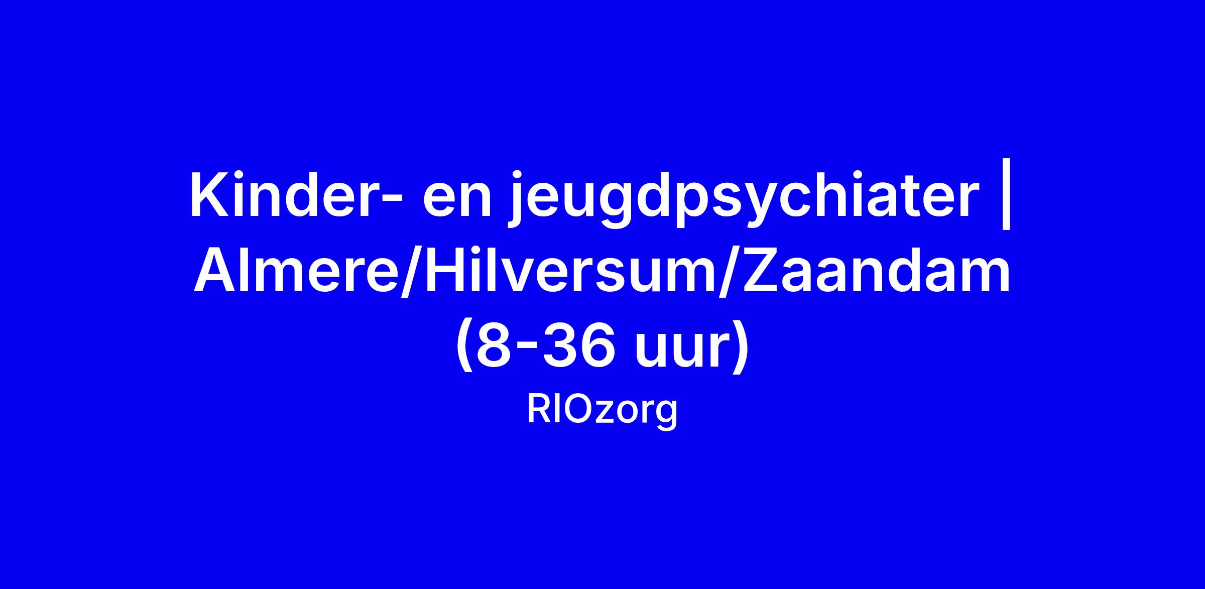 RIOzorg zoekt een kinder- en jeugdpsychiater die verder kijkt dan symptomen en meebouwt aan toekomstbestendige zorg voor kinderen en jongeren. De functie is ambulant, zonder weekend- en beschikbaarheidsdiensten, en kan in Almere, Hilversum of Zaandam ingevuld worden met 8-36 uur. Je maakt deel uit van de vakgroep Medici en levert een actieve bijdrage aan medisch beleid, het medicatiebeleid en de afstemming met huisartsen, en geeft psycho-educatie aan ouders en kinderen. Vereisten: BIG-geregistreerde psychiater, geregistreerd bij de Registratiecommissie Geneeskundig Specialisten (RGS), ruime ervaring met ADHD/ASS en somatische problematiek en stimulantia. Wat wij bieden: CAO GGZ salaris tot maximaal €10.963,- bij 1 fte, vaste aanstelling, flexibele uren, reisvergoeding, PFZW pensioen, laptop en telefoon, scholingsbudget en een informele sfeer. Solliciteren via de knop; motivatiebrief en CV richten aan Kelly Mengana; VOG en referenties/diploma-checks verplicht; acquisitie niet gewenst.