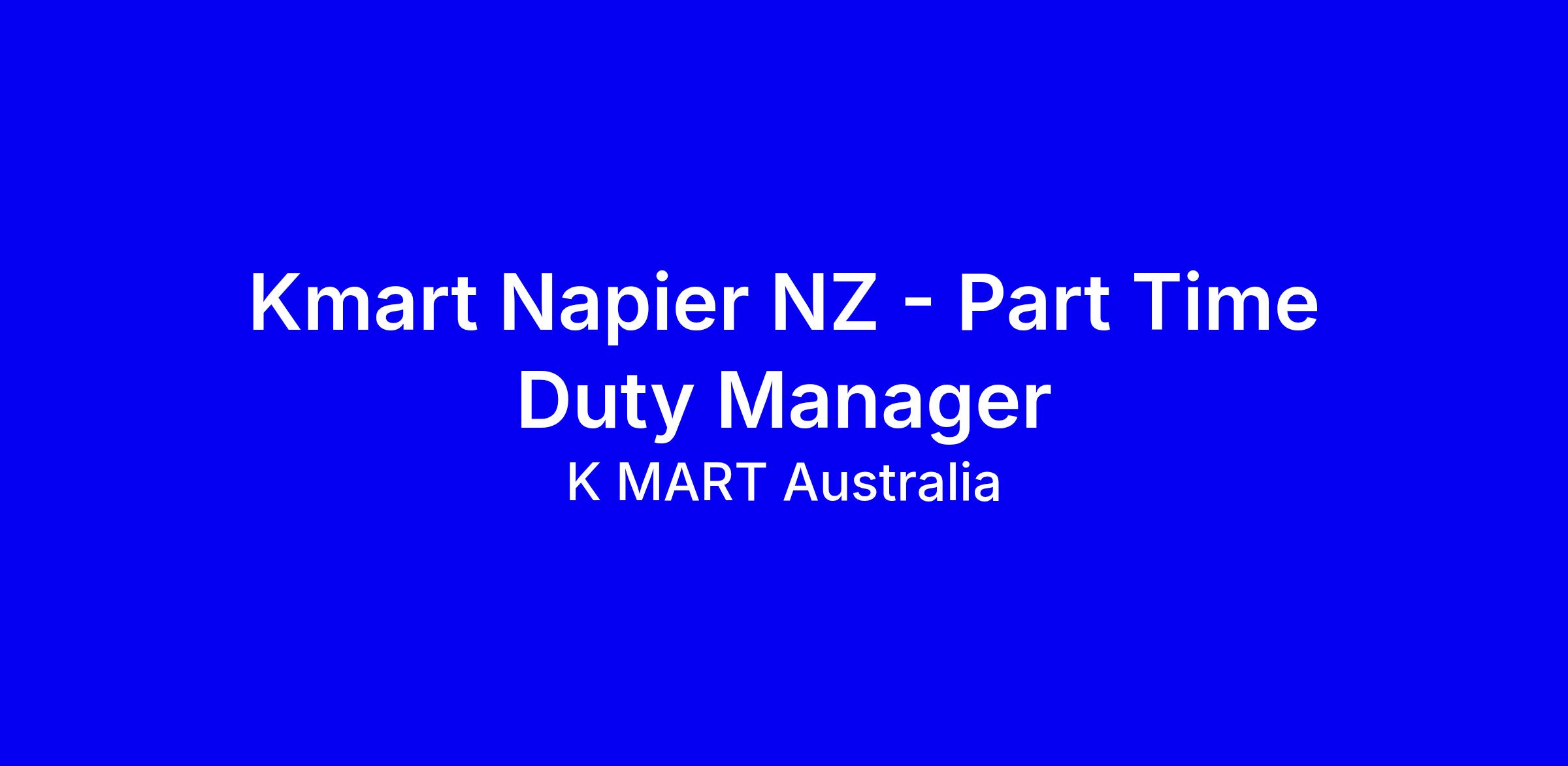 Kmart Aotearoa Napier is seeking a Part Time Duty Manager for Sunday to Wednesday, 4pm to midnight. You’ll lead and coach a high-volume team, think on your feet, follow policy, and drive results while upholding safety and customer focus. Successful applicants will have management experience in big-box or high-volume retail, a passion for developing diverse teams, and values that reflect haumaru safety and continual improvement. We offer benefits including discounts, Kmart Cares employee assistance program, a bonus scheme, Kudos recognition, service milestones, and flexible working options. To apply, tailor your resume to showcase leadership and resilience, and note any workplace adjustments by emailing [email protected].