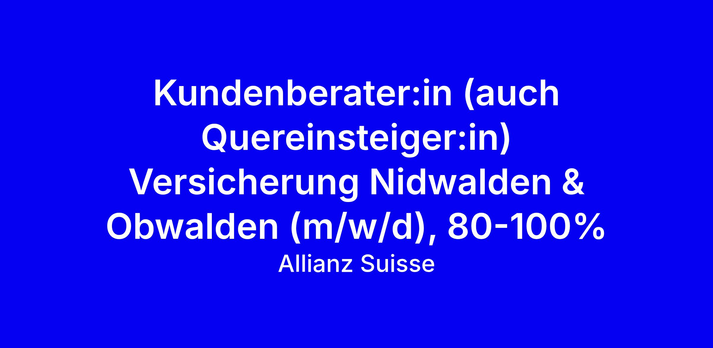 Die Allianz Suisse sucht eine kundenorientierte Vertriebspersönlichkeit als Kundenberater:in (80-100%) in der Generalagentur René Deck in Sarnen, mit Fokus auf Nidwalden und Obwalden. Quereinsteiger:innen sind willkommen; es gibt eine praxisnahe Grundausbildung, laufende Weiterbildungen und ein leistungsorientiertes Vergütungsmodell. Erwartet wird mehrjährige Versicherungserfahrung und VBV-Zertifizierung, eine selbstständige Zielverfolgung, Freude am Kontakt mit Menschen sowie ein gutes regionales Netzwerk. Nutzen Sie die Chance auf abwechslungsreiche Aufgaben, viel Freiraum und Karrierewege in Verkauf, Vorsorge oder KMU. Tipp für Ihre Bewerbung: Betonen Sie konkrete Vertriebserfolge, VBV-Zertifizierung, Ihre Netzwerke vor Ort und Ihre Motivation für 80-100%; senden Sie Ihre Unterlagen an Sebastian Kühn, 058 357 58 71.