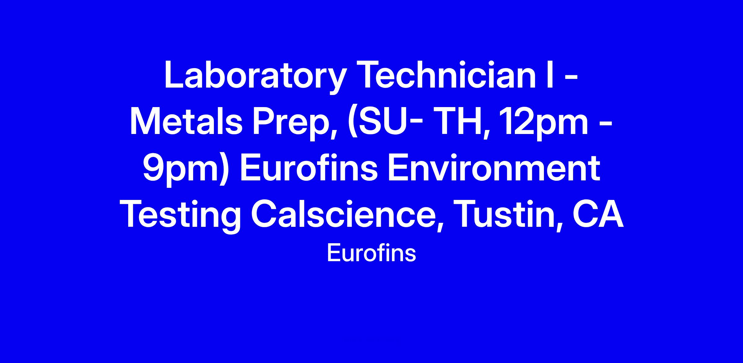 Eurofins Environment Testing Southwest is hiring a Laboratory Technician I in Tustin, CA for a Sunday through Thursday 12 pm to 9 pm shift with overtime and weekend opportunities. You will weigh and measure samples, digest and prepare soil and water for trace metal analysis, document prep details, prepare reagents, and maintain equipment while following QA programs and SOPs and collaborating with the analytic and project teams. The ideal candidate has a high school diploma, basic chemistry coursework, some lab experience, good math and organizational skills, and the ability to multi-task and work independently. Pay is 18 to 22 per hour plus full benefits. Tips: tailor your resume to show prep, digestion, data recording, safety, and teamwork; highlight shift availability, English proficiency, and willingness to learn. Eurofins values diversity and development.
