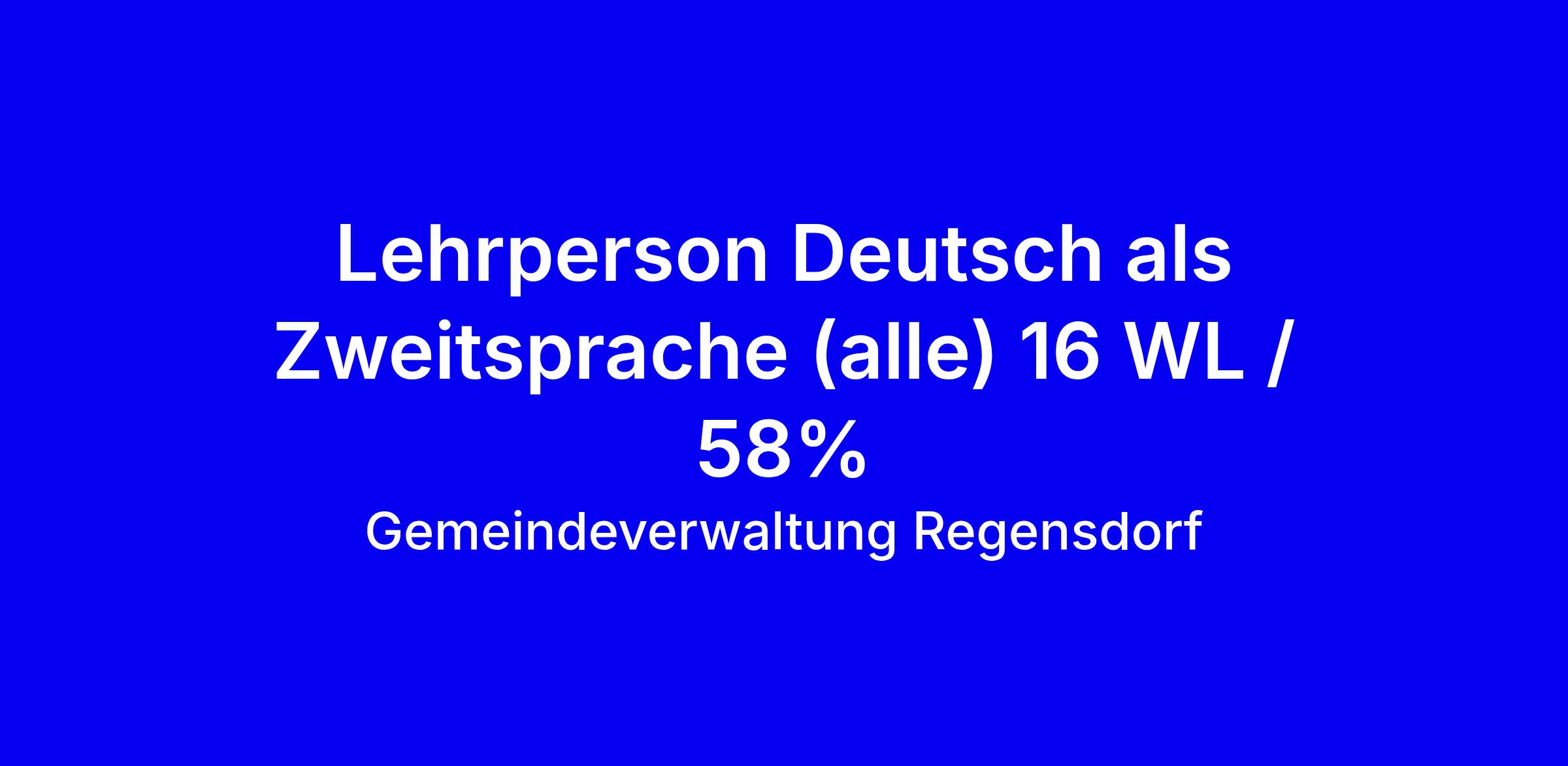 Die Gemeinde Regensdorf sucht ab 1. August 2026 eine kreative und empathische Lehrperson Deutsch als Zweitsprache (16 WL, 58%), davon 4 WL Kindergarten und 12 WL Primarstufe. Die Stelle ist vor Ort in Regensdorf. Sie erwartet sinnstiftende Sprachförderung, Gestaltungsspielraum für neue Unterrichtsansätze und eine unterstützende Teamkultur mit regelmäßigen Austauschgelegenheiten. Zu den Vorteilen zählen ein SBB-Gutschein, großzügige Weiterbildungs- und Vergünstigungsmöglichkeiten. Anforderungen: Lehrdiplom idealerweise mit CAS DaZ Volksschule oder Bereitschaft, diesen gemeinsam mit uns zu erwerben; Freude an integrativem Unterricht, interkulturelle Kompetenz, Humor und eine lösungsorientierte Haltung. Bewerben Sie sich online; Fragen an Claudia Bogana oder Dino Brembilla, Tel. 043 343 84 01, [email protected].