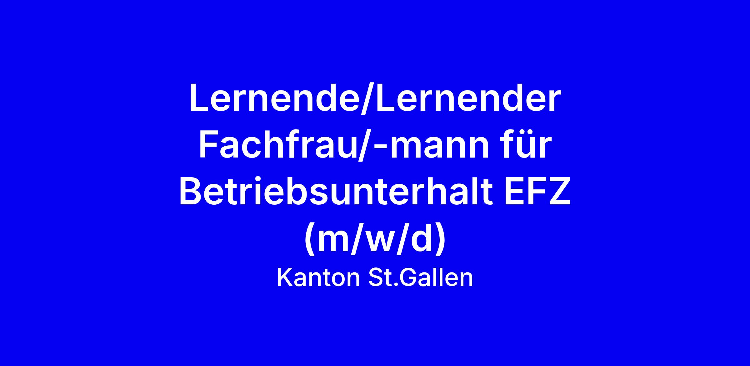 Der Kanton St.Gallen sucht ab August 2026 eine Lernende Fachfrau bzw. einen Lernenden für Betriebsunterhalt EFZ im Hochbauamt, 100% Pensum, Standort St.Gallen. In der dreijährigen Ausbildung lernst du Unterhalt, Pflege und Reinigung von Hochbauten der öffentlichen Verwaltung und sammelst vielseitige Praxis in Haus und Außenbereich. Gesucht werden engagierte Menschen mit abgeschlossener obligatorischer Schule, Multicheck Gewerbe, guten Deutschkenntnissen, handwerklichem Geschick, technischem Verständnis, Freude an Sauberkeit sowie Belastbarkeit und guten Umgangsformen. Wir bieten eine vielseitige, gezielt geförderte Ausbildung in der öffentlichen Verwaltung. Bereit für den nächsten Schritt? Dann bewerbe dich online und sende idealerweise deinen Multicheck, Motivationsschreiben, Lebenslauf und Referenzen. Bei Fragen wende dich an Louis Bircher, 058 229 43 77.