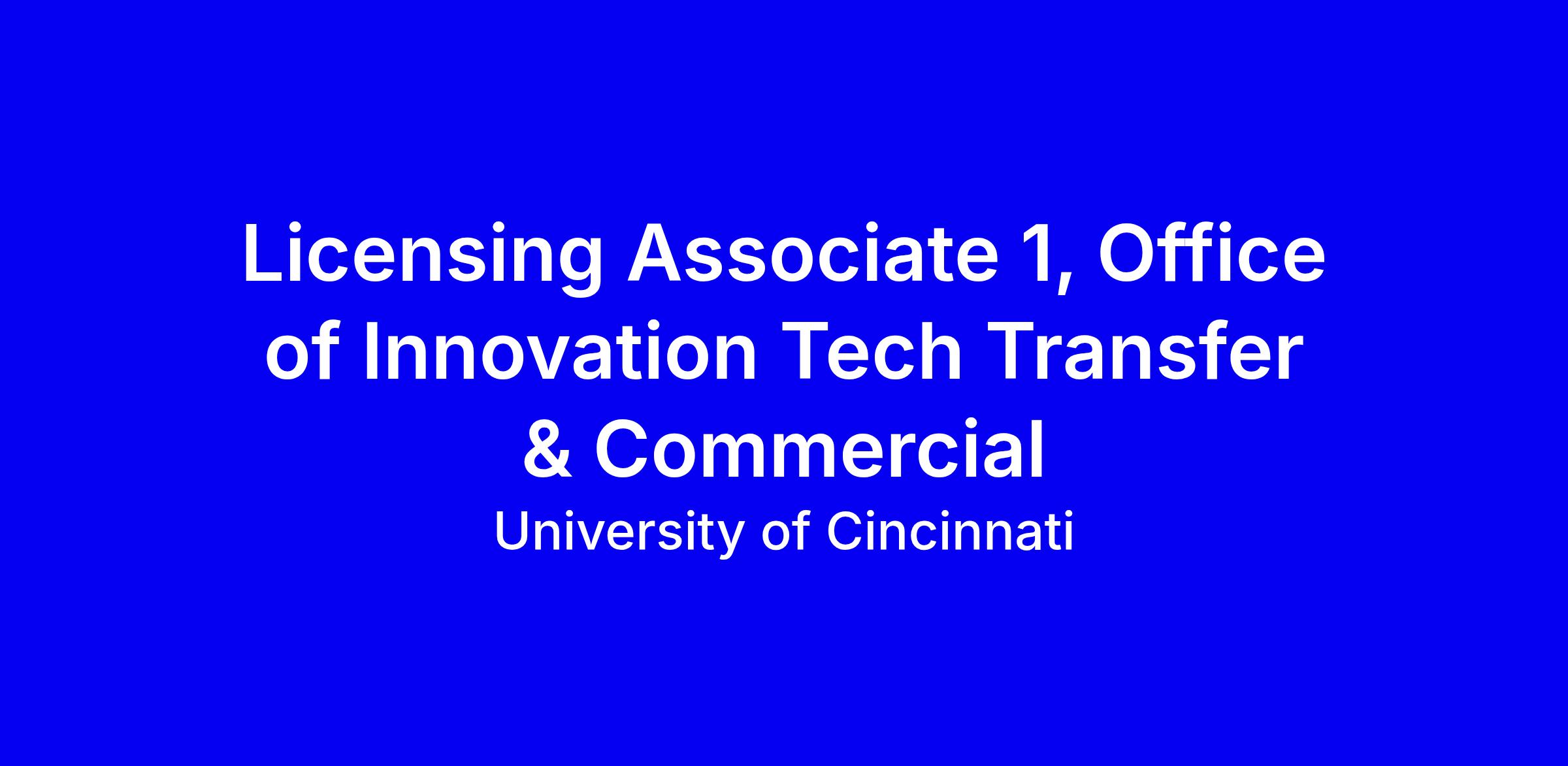 Reporting to the Assistant Vice President for Technology Transfer, the Licensing Associate assists in identifying and evaluating university technologies to support their transfer to external partners. The selected candidate will work closely with researchers to understand their innovations, develop an understanding of the relevant intellectual property and technology landscape, prepare non-confidential summaries, and support coordination with the commercialization team to create opportunities for UC’s technology portfolio. The Licensing Associate will gain experience supporting technology development and managing intellectual property in an academic environment. The Licensing Associate will develop strong working relationships with university researchers, intellectual property counsel, and colleagues in the Office of Innovation and the Office of Research. The Licensing Associate will also work collaboratively with other members of the Technology Transfer team, including the Commercialization team, to support coordinated engagement across the University of Cincinnati.