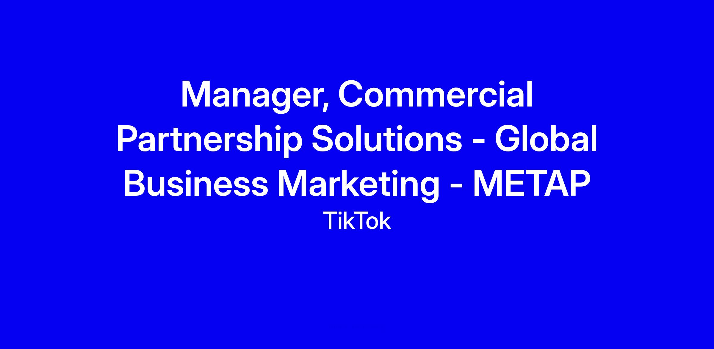 TikTok seeks a Manager, Commercial Partnership Solutions in Global Business Marketing for METAP, based in Dubai, full-time onsite. This role designs bespoke and scaled partnership programs that connect brands with TikTok content opportunities, driving incremental revenue through IP and rights deals and bridging content, creators, and sales. You’ll lead cross-functional collaboration across User Operations, Business Development, Product, Marketing, Sales, and Research to craft content-led solutions around seasonal moments, LIVE opportunities, and editorial sponsorships, while partnering with sales to tailor monetization to client needs and with Marketing to educate the market. To apply, emphasize revenue impact from partnerships, successful IP negotiations, regional METAP experience, and a portfolio of cross-functional leadership.