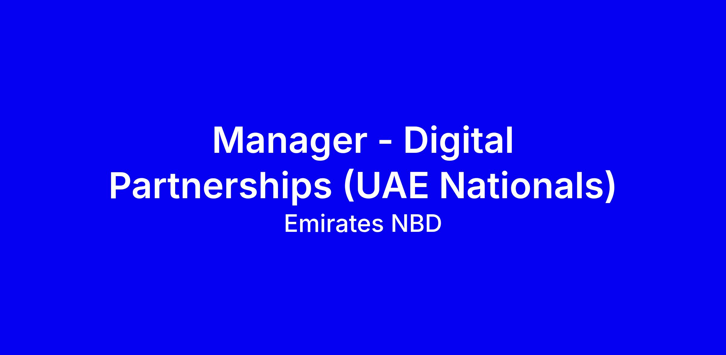 Emirates NBD seeks a Manager of Digital Partnerships to shape a strategic landscape across Government, Academia, Corporates and Fintech Partners, working with leaders to define 3-year roadmaps, manage partner portfolios and drive engagement plans within the Partnership Operating model. You will coordinate internal teams and external vendors, ensure timely delivery, mitigate risks, and steer steering committees while upholding data confidentiality and compliance. Ideal candidates have 5-8 years in IT or related fields, a degree, strong account or program management experience, knowledge of at least two banking verticals, and Prince2, PMP or ITIL. UAE Nationals preferred; apply with a tailored resume highlighting governance, cross functional leadership, measurable impact, and concrete partnership wins with government, academia, corporates or fintechs.